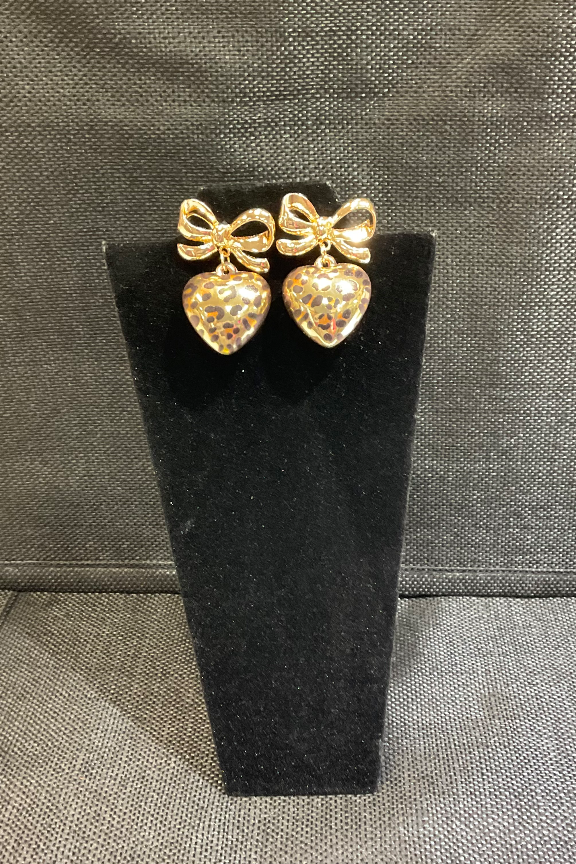 These Bow and Heart Drop Statement Earrings are playful, polished accessories with a shiny gold-tone bow and leopard-print heart dangles. The earrings feature a small stud-style bow that suspends a lightweight enamel heart for movement and visual interest. Perfect for adding a flirty, feminine touch to evening or casual looks, they pair well with simple necklines and soft waves.