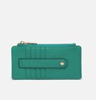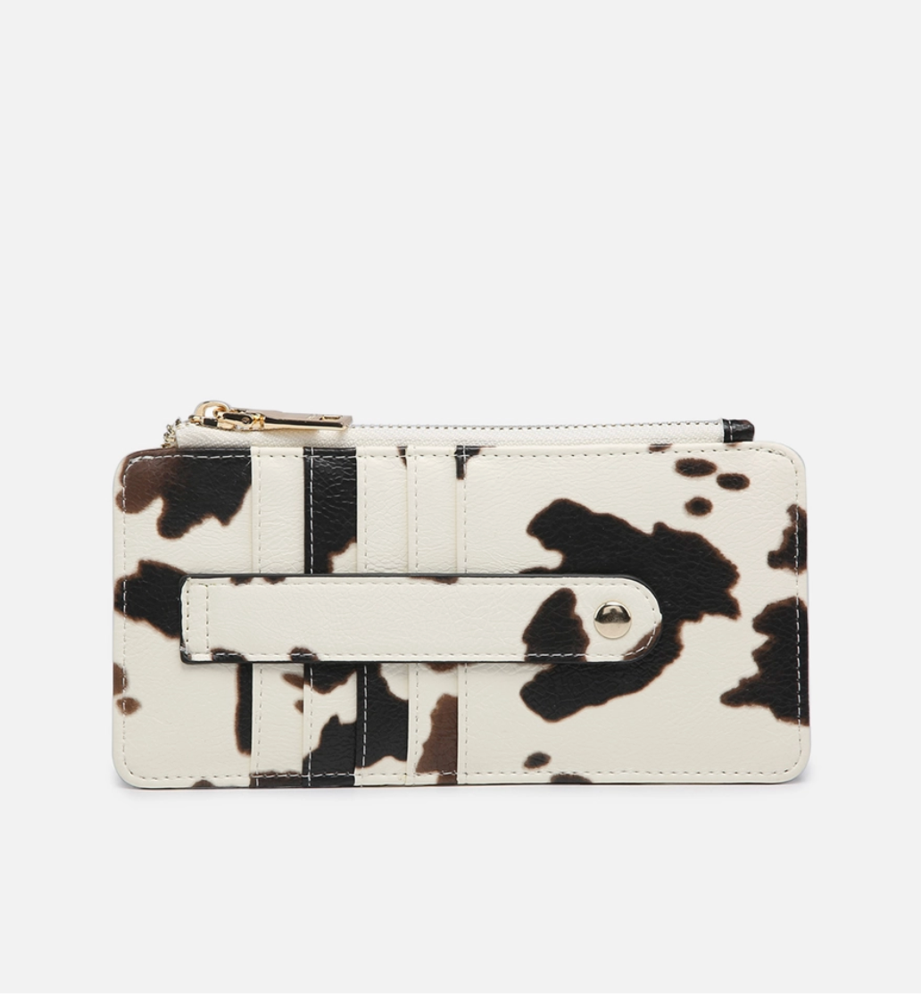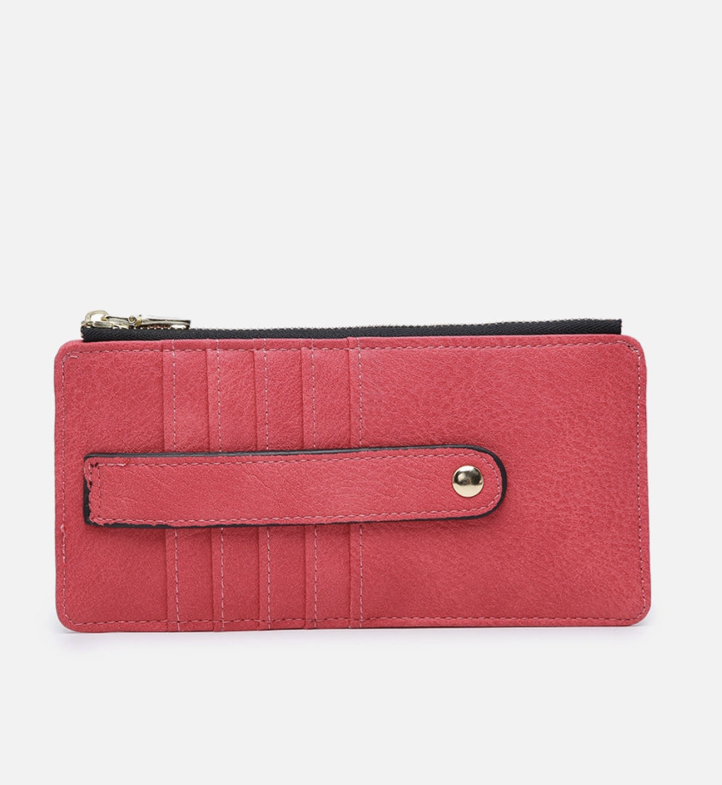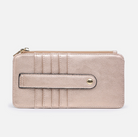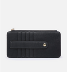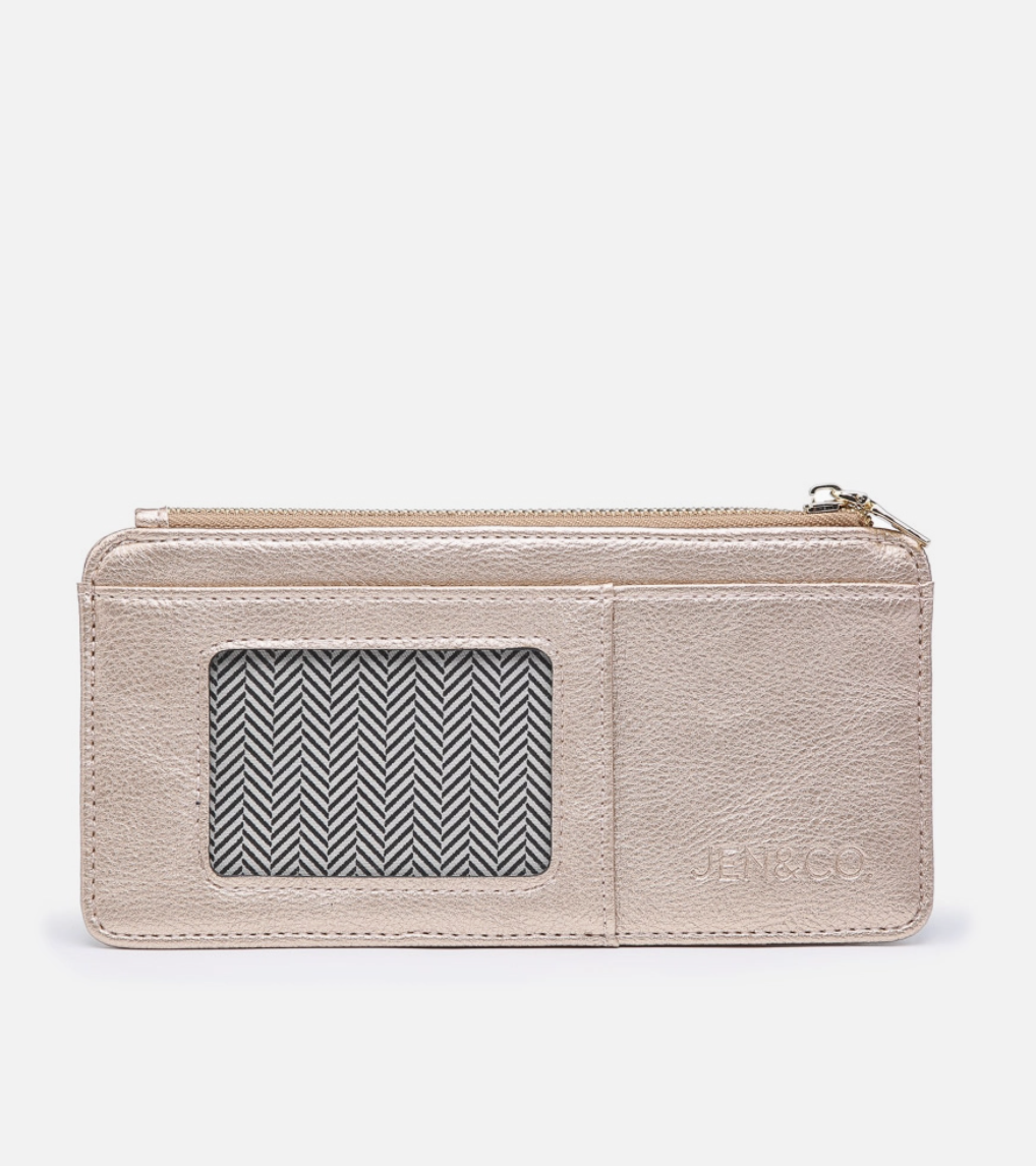 A compact, streamlined card holder wallet in a metallic pebbled finish that keeps essentials organized without bulk. The Jen Slim Card Holder Wallet offers multiple external card slots, a zip top compartment, and a snap‑detail strap for easy grip. The design is crafted in soft vegan leather for a luxe look with everyday durability. jen & co balances practical organization with a polished silhouette that transitions seamlessly from work to weekend nights out.