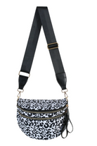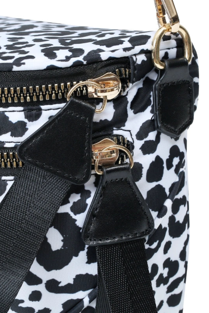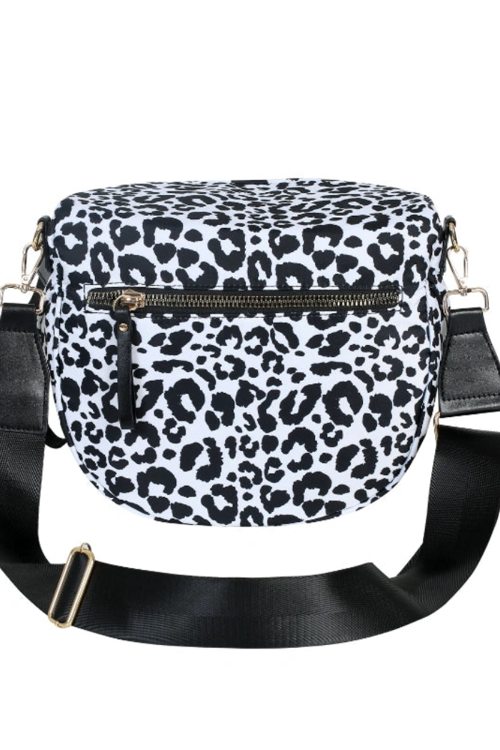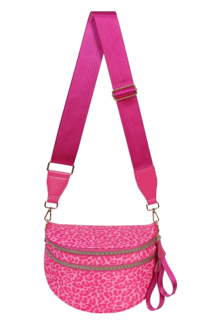 The Leopard Print crossbody Belt Bag is a soft, slouchy shoulder-style bag with a wide adjustable strap and a curved flap that zips closed. The bag appears to be made from lightweight nylon with a vivid leopard pattern and gold-tone hardware. Its roomy interior and casual silhouette make it perfect for everyday off-duty wear or running around town. Perfect for your vacations.
