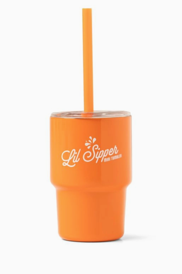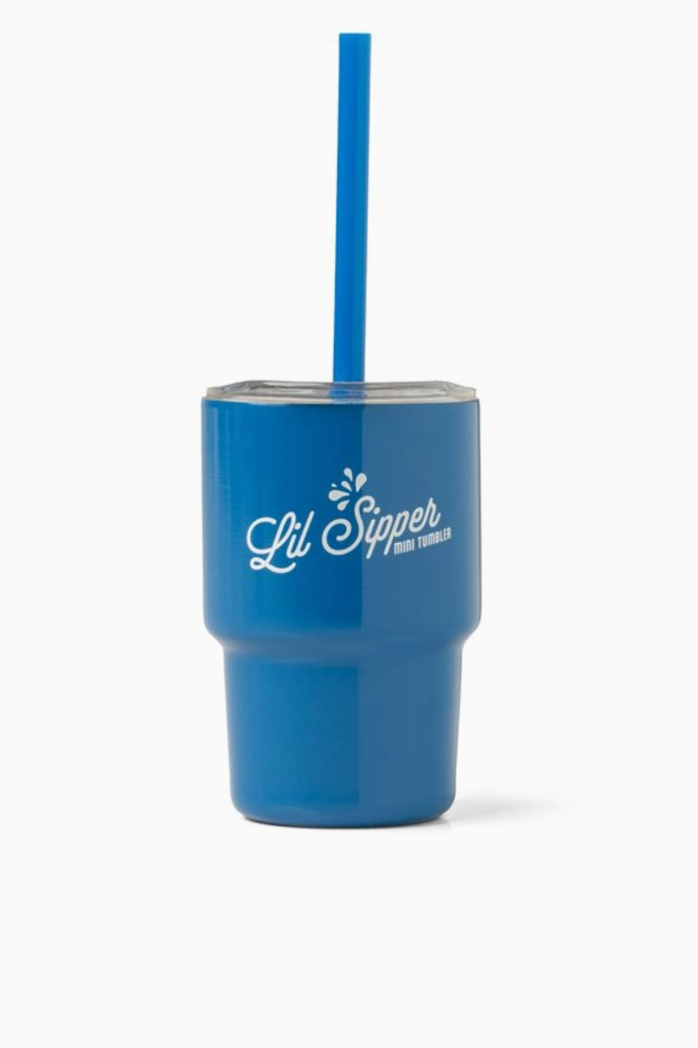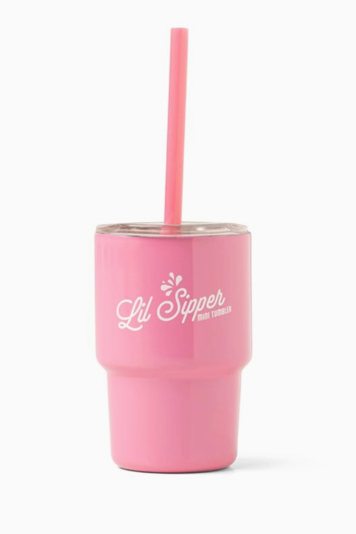 A compact pink mini tumbler with a clear lid and matching straw, perfect for small drinks on the go. The Lil' Sipper Mini Tumbler has a slim, double-tiered silhouette that fits most cup holders. DM Merchandising designed this cheerful drink cup for everyday use and easy sipping. Its glossy finish and printed logo give it a playful, giftable look.