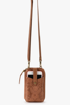 Exterior contains front phone pocket with snap tab closure, back 2 credit card slots