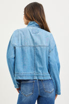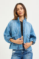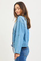 A light-wash denim cargo jacket with a relaxed, slightly cropped silhouette and utility flap pockets. Features a stand collar, front zip and snap closure, and a drawstring hem for an adjustable fit. Its soft, faded denim gives a casual, lived-in look that layers easily over tees and sweaters. This jacket is finished with button-tab sleeve details for an on-trend, functional touch.