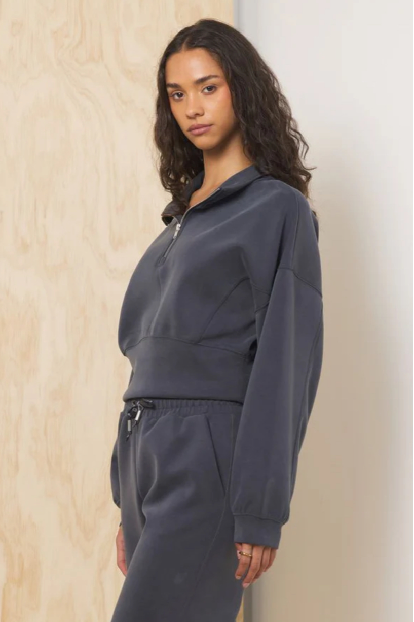 The Luxe Cloud Quarter Zip combines refined style with exceptional comfort. Crafted from the soft Luxe Cloud fabric in a sophisticated graphite shade, this quarter-zip pullover is designed to keep you warm without bulk. Its high-quality material offers a lightweight yet cozy feel, perfect for layering during cooler days.