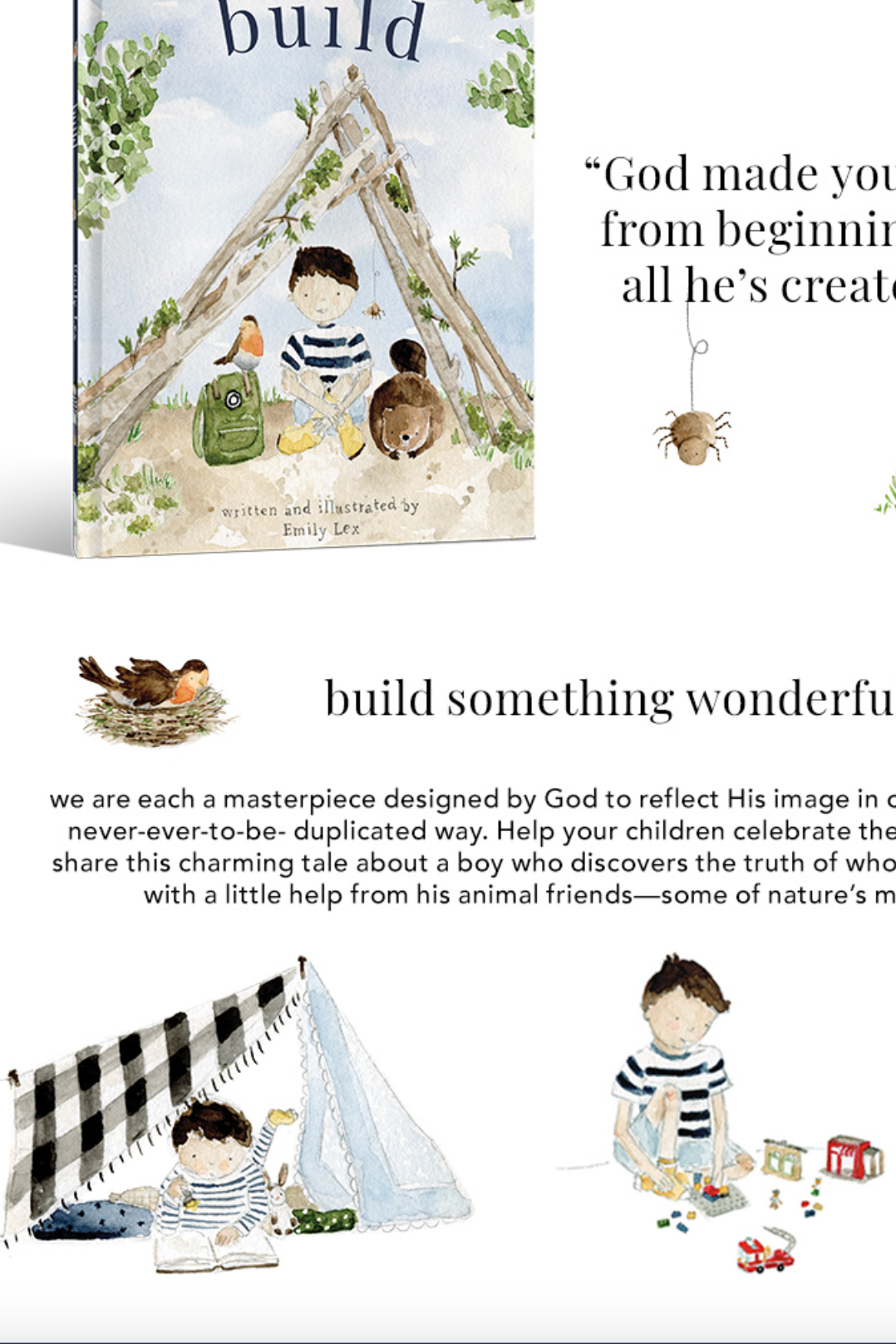 Featuring original writing and watercolors from popular author and artist Emily Lex, Build will become a family reading time favorite and spark important conversations with your children about their unique place in God’s creation.