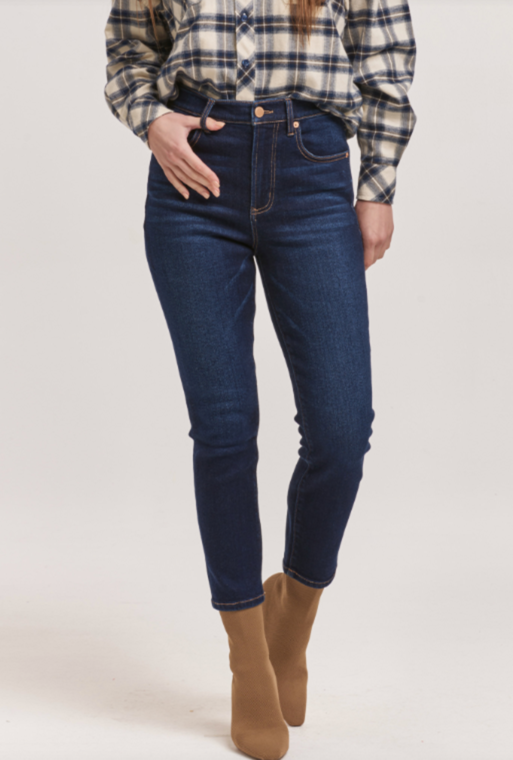 Super high rise slim straight jeans. It's the groovy fit that sits at natural waist and fits slender from hip and thigh with lightly tapered leg. Cropped inseam on comfort stretch denim accented with hand sanding hip & back knee whiskers, pocket grindings, frayed leg opening & side seam vents, washed in effortless shade for any pairings.