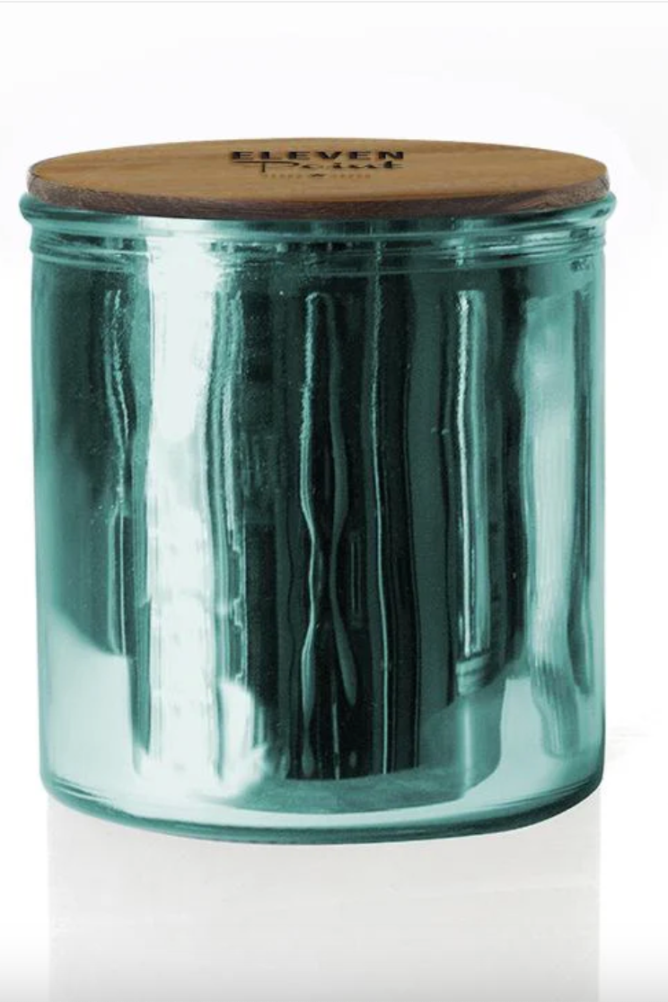 Hand poured, 14 oz soy blend candle, in a large shiny turquoise metallic finished glass vessel, topped with an Eleven Point branded wooden lid (4 x 4).