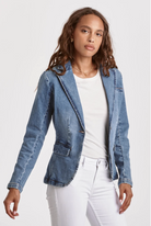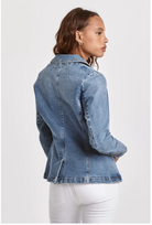 Denim blazer jacket, long sleeve with button closures, seams & center back vent, flap pockets & darts for shape support. Medium wash denim on standard fit.