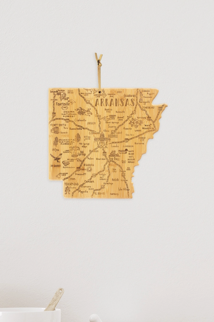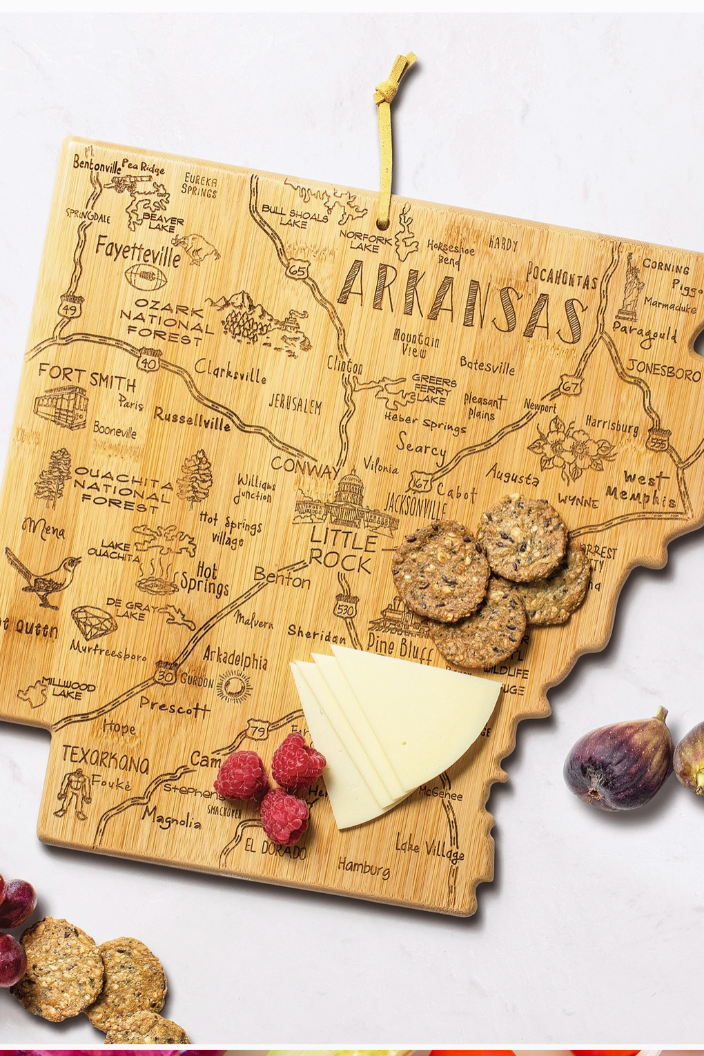 Celebrate Arkansas with this beautifully crafted bamboo cutting board! Shaped like The Natural State, it features laser-engraved artwork highlighting the iconic towns, landmarks, and sights that define Arkansas. Shoppers love using it as a fun, conversation-starting charcuterie board for serving crackers, cheese, meat, fruit, candy, and other favorite snacks.