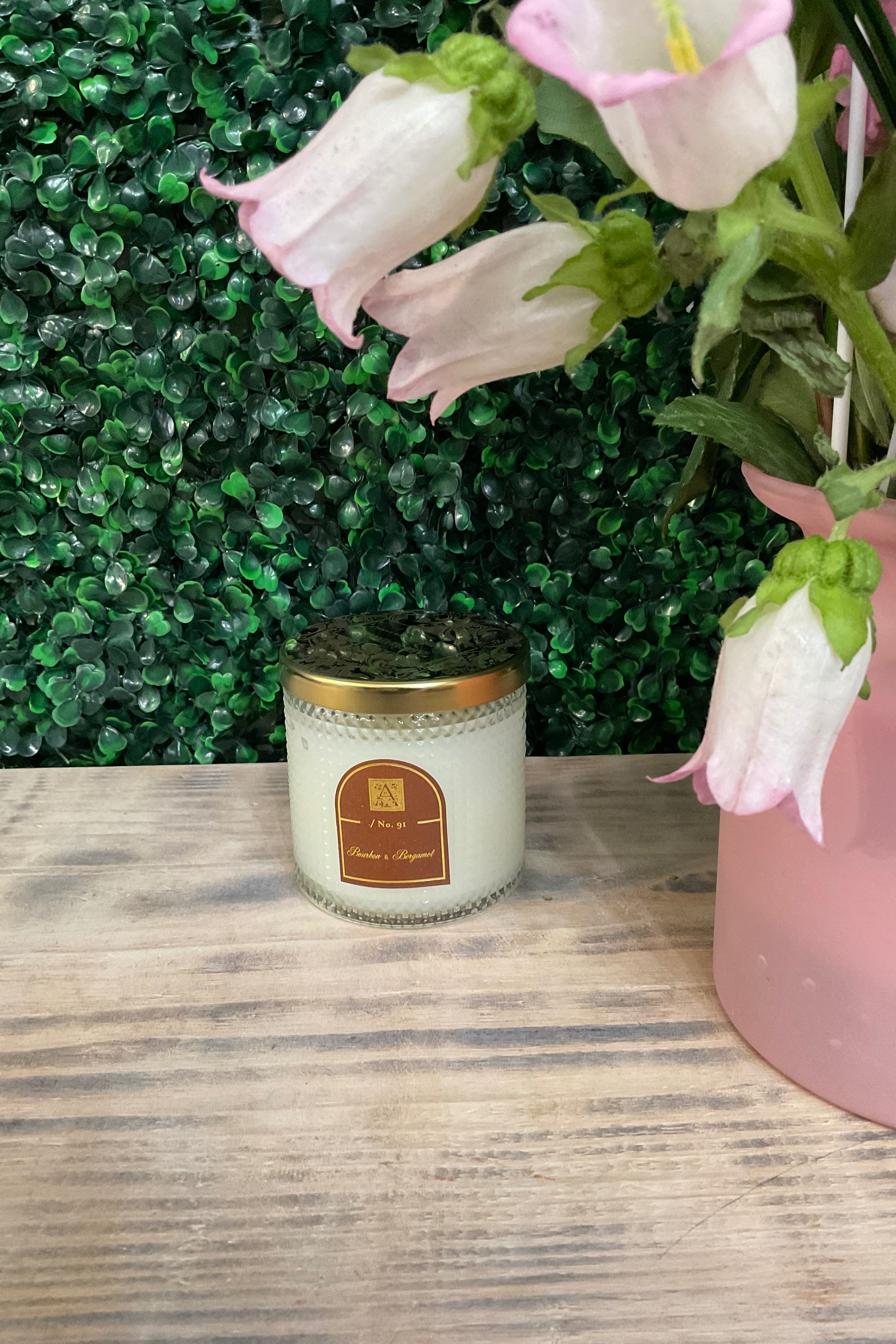 The Bourbon & Bergamot Textured Glass Candle will make your home feel cozy with bold citrus fragrance softened with cashmere musk and hints of bourbon. Our candles are all hand-poured in Arkansas. Made with a proprietary wax blend, ethically sourced containers and cotton wicks. Light one of these aromatic candles and transport yourself to a memory or emotion.