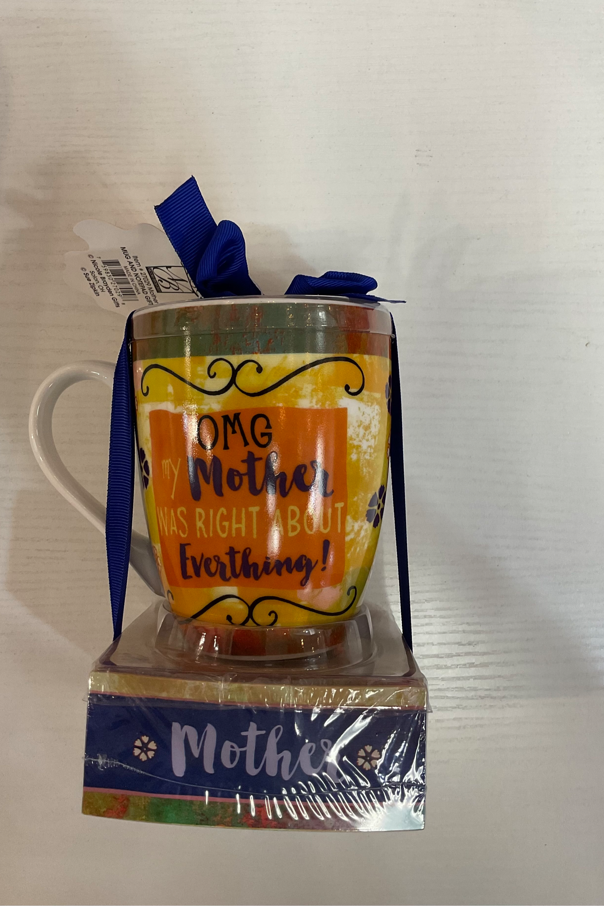 Our Just for Laughs mug and note gift set is a cute and functional gift for the extra special people in your life! Gift set includes a 12 oz mug that is dishwasher and microwave safe and a matching 3.75" x 1.5" notepad, packaged together with a decorative ribbon. Features front of mug message: Sometimes I open my mouth and my mother comes out / Back of mug message: OMG my mother was right about everything!