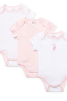 A set of short-sleeve baby one-piece bodysuits in soft pink and white with a tiny ballerina embroidery. The Little Me Ballerina One-Piece Bodysuit set is made from soft, breathable knit for everyday comfort and easy changes with snap closures at the leg. Little Me designs the collection with delicate trim and a classic silhouette that layers well and feels gentle on newborn skin.
