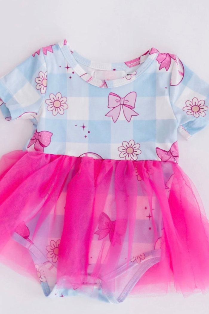 The Bows & Baseball Tutu Onesie is a baby girl's short-sleeve one-piece featuring an attached bright pink tulle tutu and a playful bow and baseball print on a blue gingham background. Mila & Rose designed the soft knit bodysuit to combine everyday comfort with a dress-up silhouette. Snap closures at the crotch allow for quick diaper changes. It's ideal for photos, parties, or everyday twirling fun.