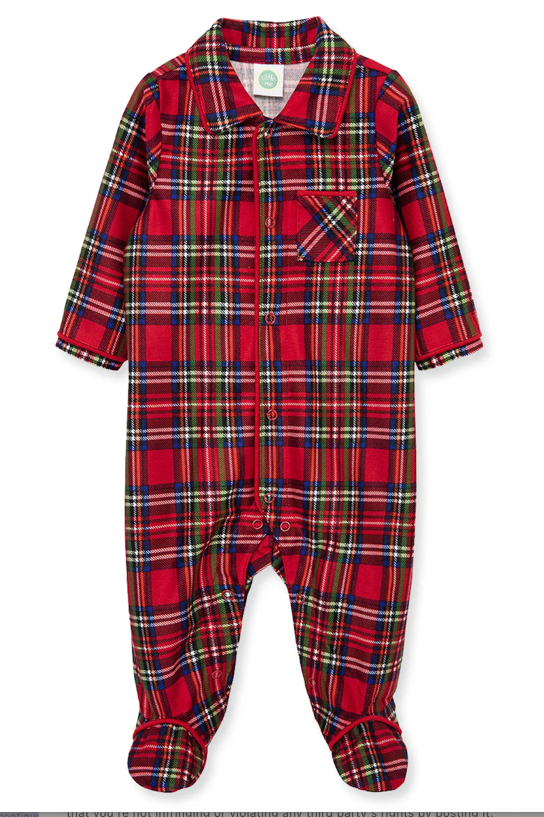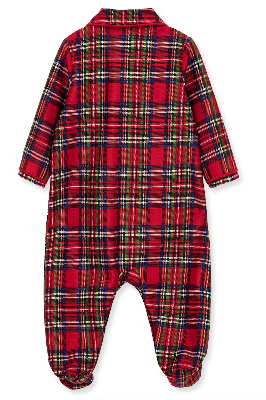 A classic collar and pocket decorate a newborn babys' pajama footie finished with effortless snaps and tartan.