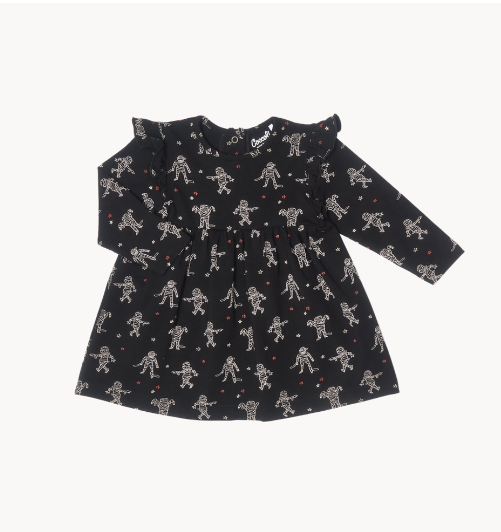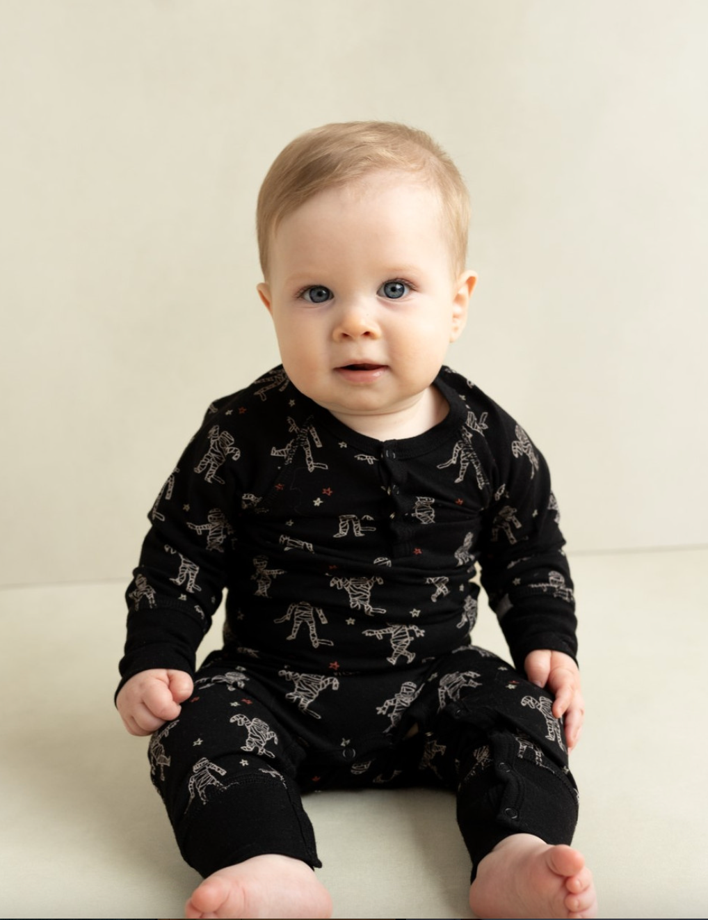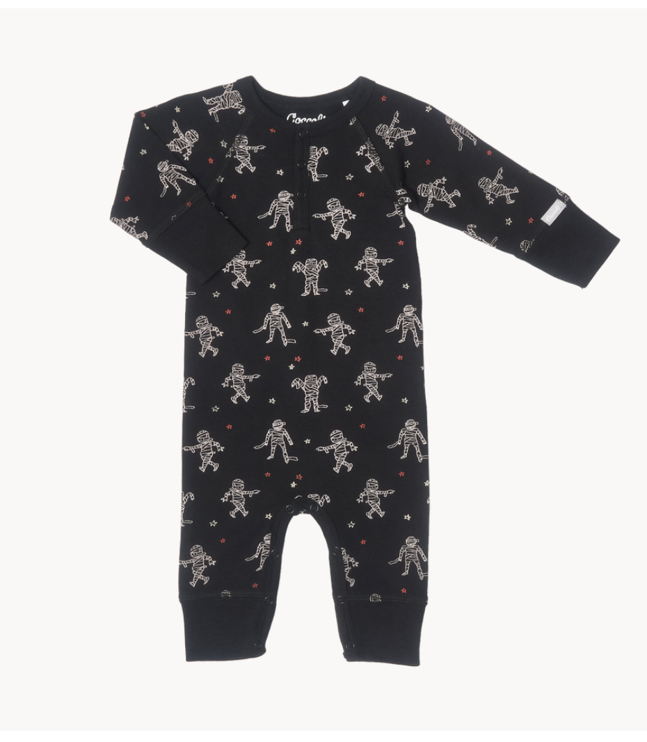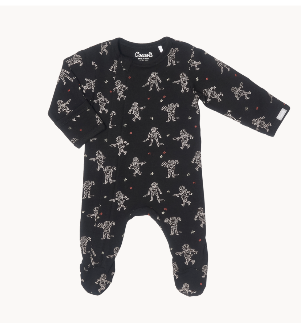 Coccoli, Baby/kid Boy/Girl/Neutral Cotton-modal Zipper Footie, Color MUMMIES ON BLACK, 49% cotton/47% modal/4% spandex-knit, Comes In Sizes N-18m Footie's practical hidden 2-way zipper with an inner placket to protect your baby's skin opens from neck to foot. It has mitten cuffs on sizes N (newborn) and 1 month to prevent scratching, and has an anti-slip feature under the feet on sizes 3 months to 18 months. The back of the foot has a soft elastic to ensure that baby's foot stays where it belongs! The fit is snug on sizes 12m and 18m, and no flame retardant chemicals are used. Designed in Canada.
