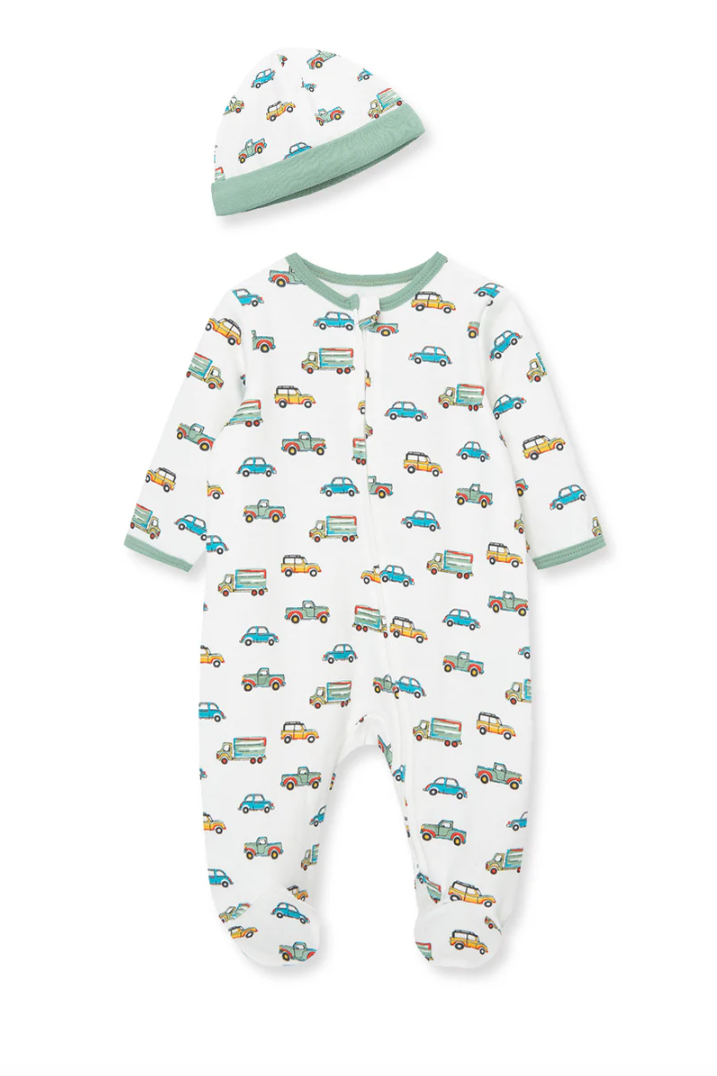 Your baby boy will be cute and comfy in this car theme sleeper. The adorable one-piece footie is perfect for your future little on the go babe. Outfit is 100% cotton, and has front zipper closure from neck to feet for easy dressing. Long sleeves are perfect for extra comfort.