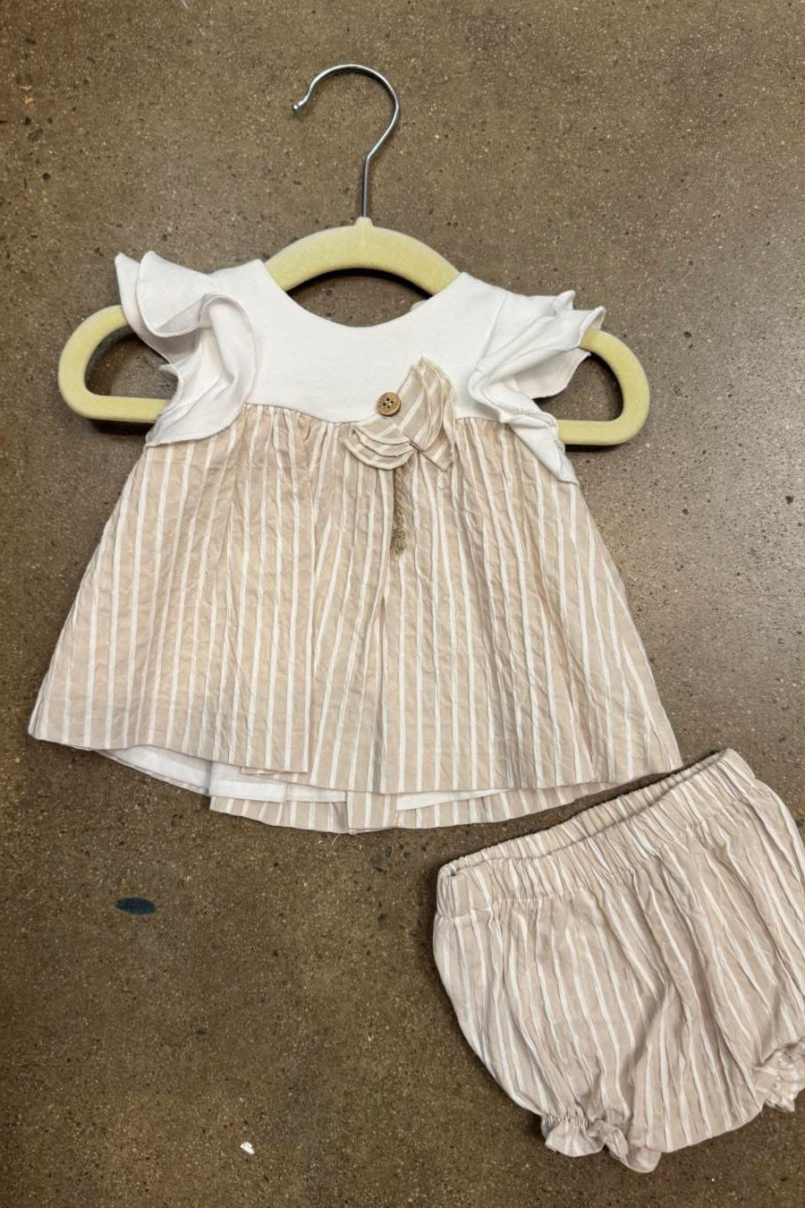 Sweet little set. Soft knit top with bottom half in crinkle stripe cotton. Complete the look with cute stripe Bloomers.