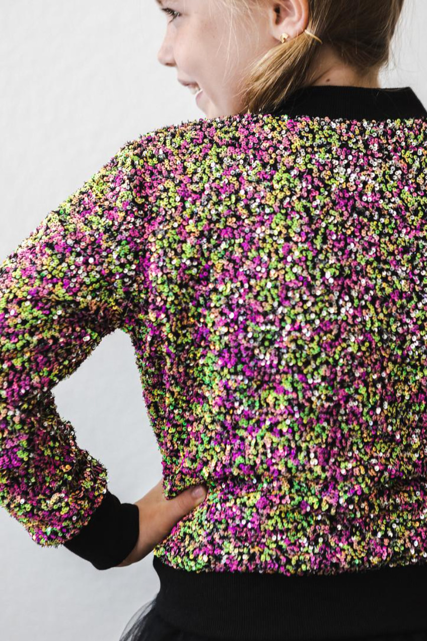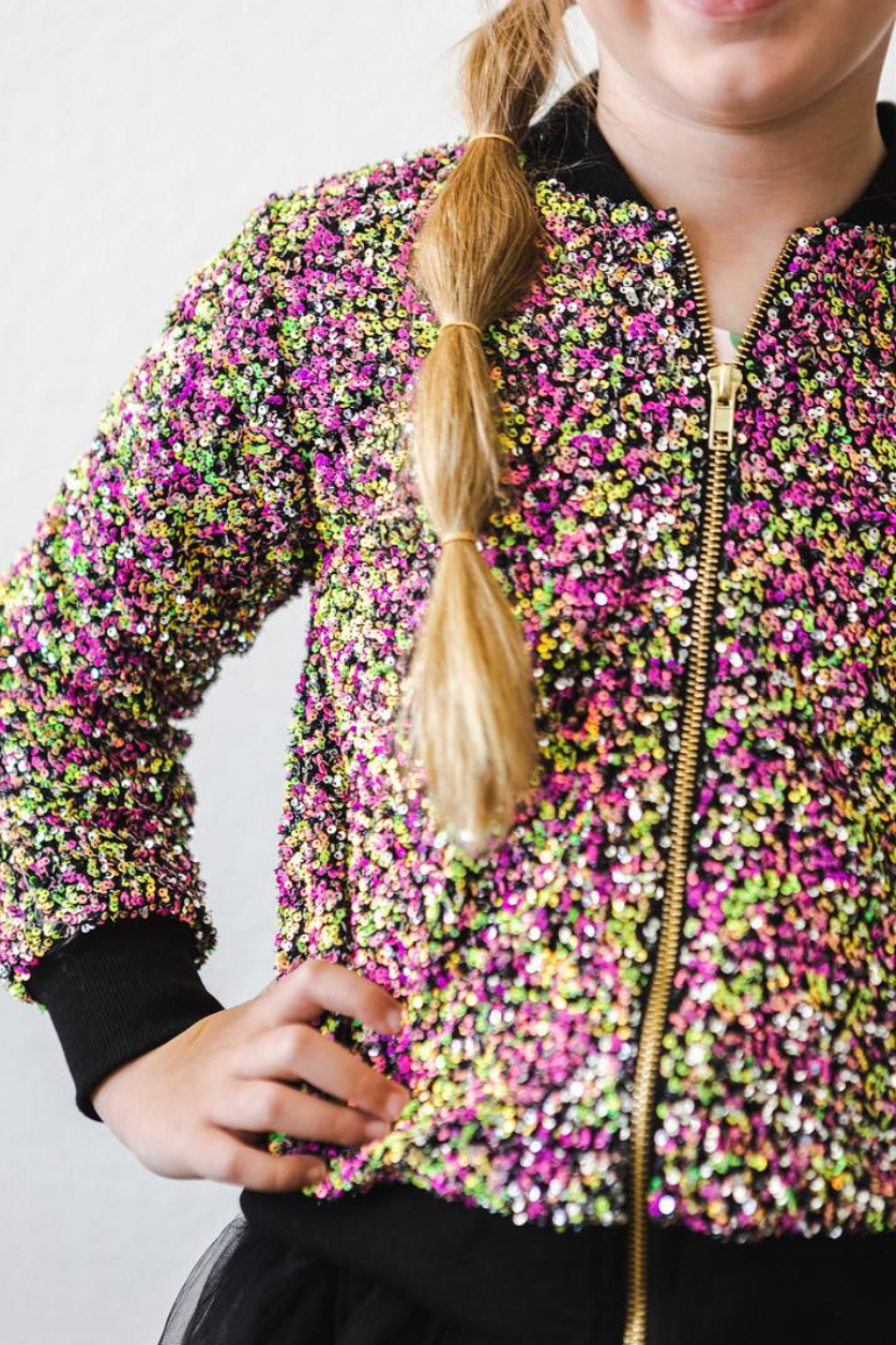 A dazzling piece that will make your little one shine like a star! Perfect for both special occasions and everyday wear. Whether she is twirling, posing for photos, or simply embracing her inner fashionista, this sequin jacket is sure to make a statement. Let her sparkle and shine with confidence and style!