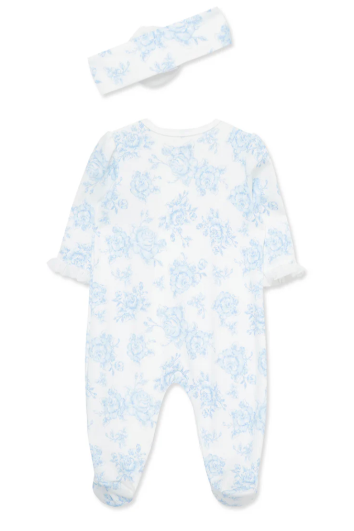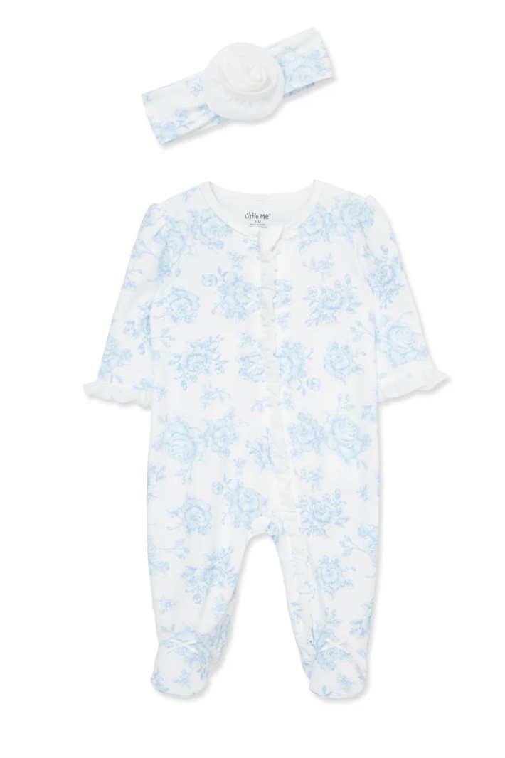 A pretty blue rose print covers this newborn footie and headband set for your baby girl.