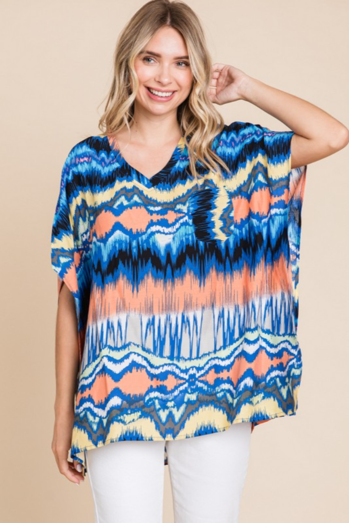 Print boxy top with a V-neck, chest pocket, short kimono sleeves, and side slit detail.
