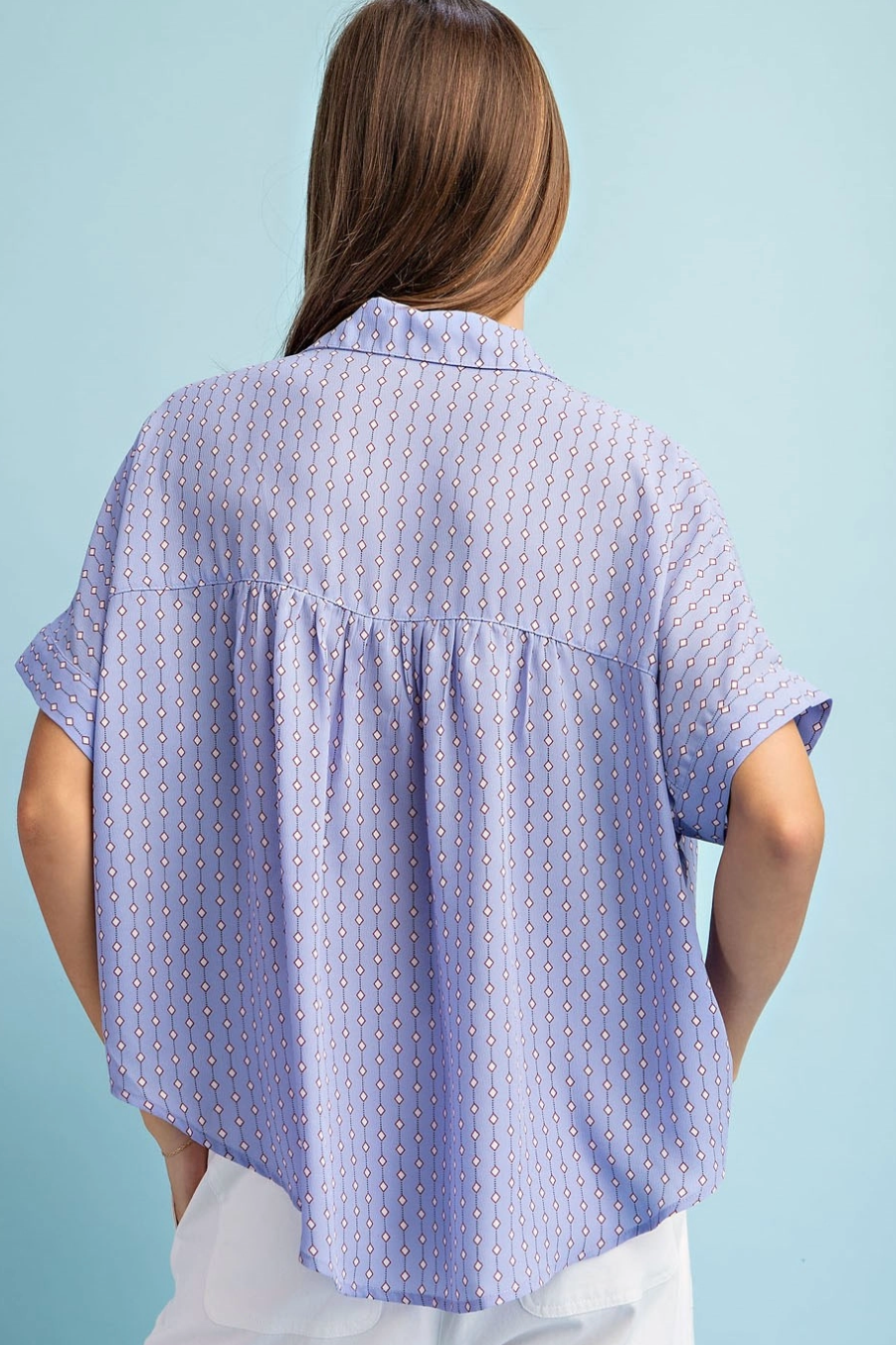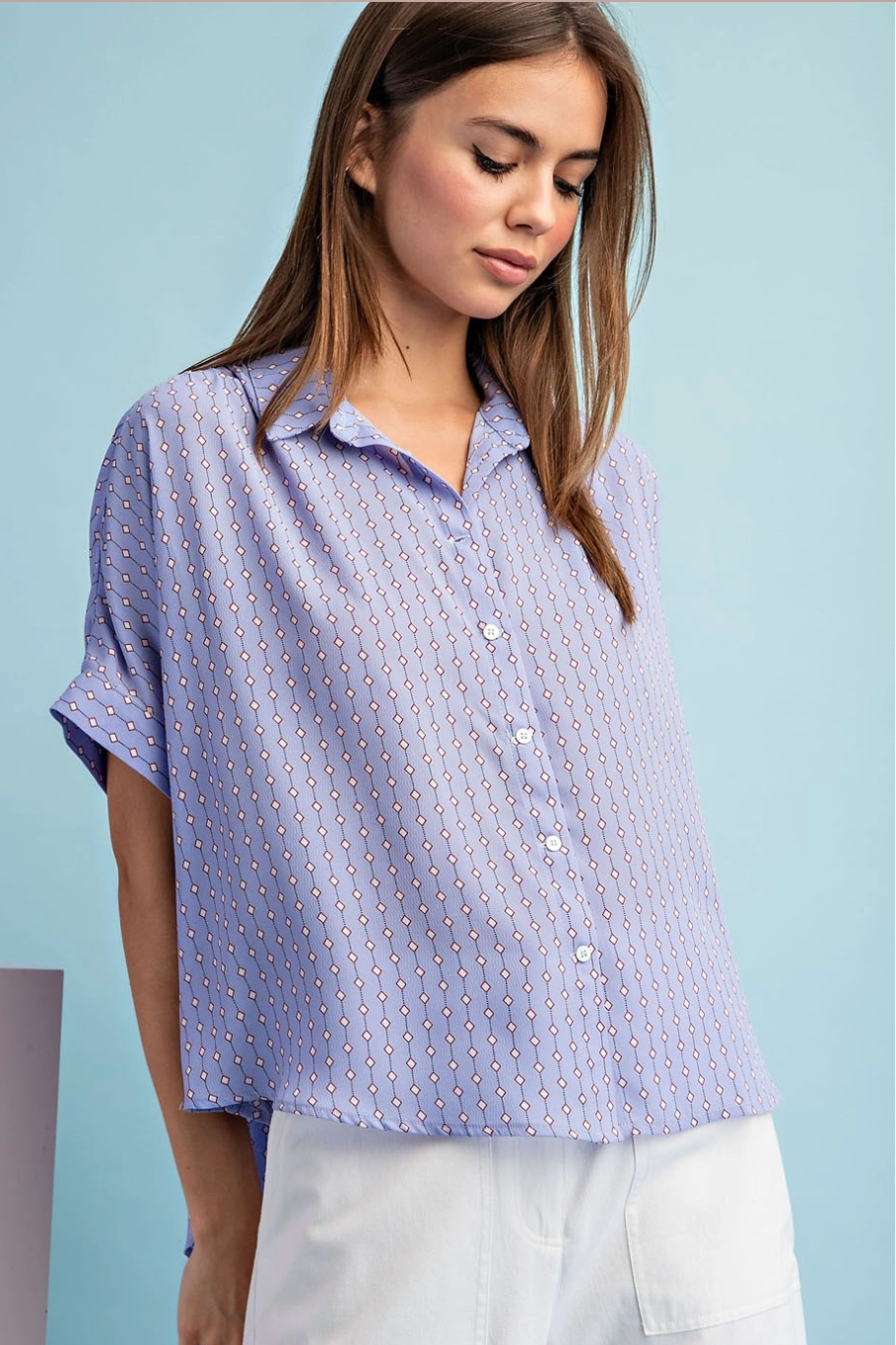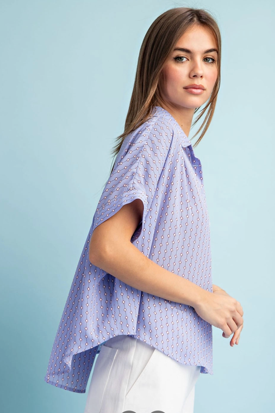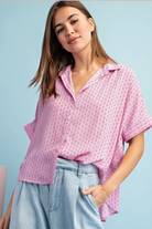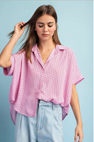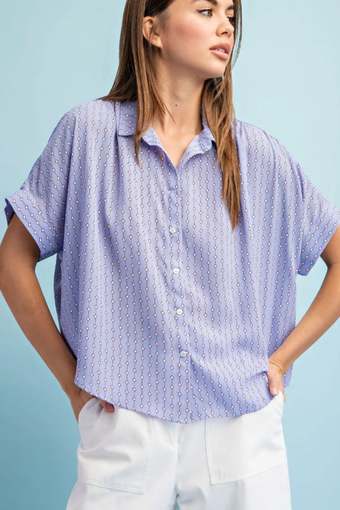Lightweight and breezy, the Bubbly Button Up Top is a relaxed button-down with a soft shirt collar and short sleeves. The printed fabric drapes loose for an easy, casual silhouette that tucks neatly into high-waist bottoms.