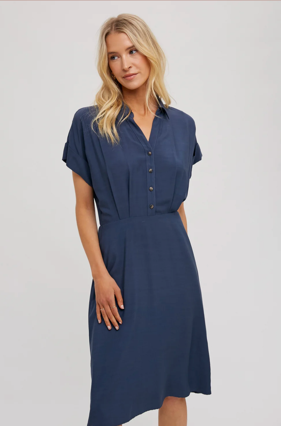 The Button Front Shirt Dress is a polished, knee-to-midcalf dress with a relaxed bodice and tailored waist. Soft, drapey fabric and a short cuffed sleeve create an effortless, work-ready silhouette. Pair it with loafers or sandals for a versatile look that transitions from office to weekend.