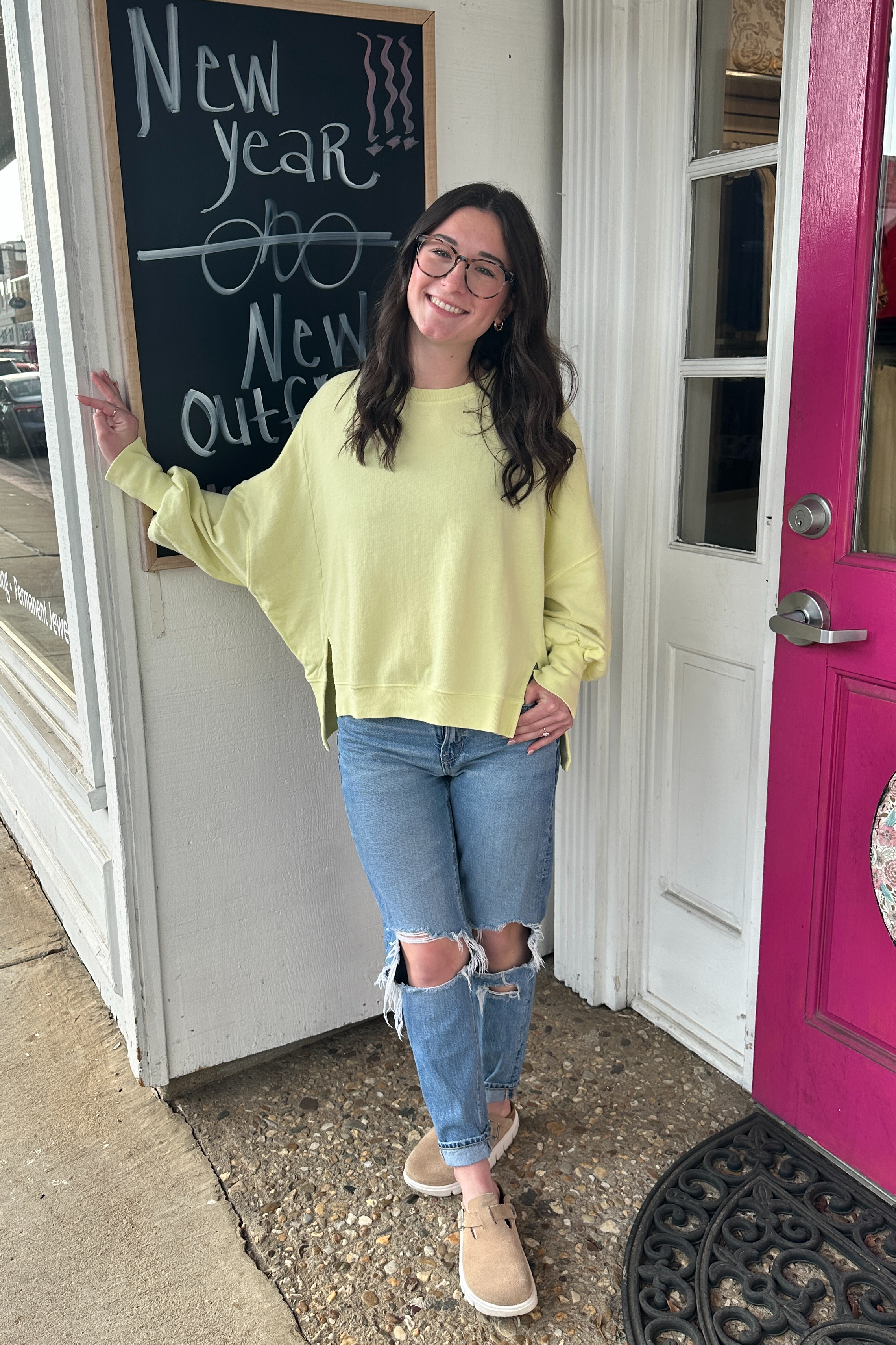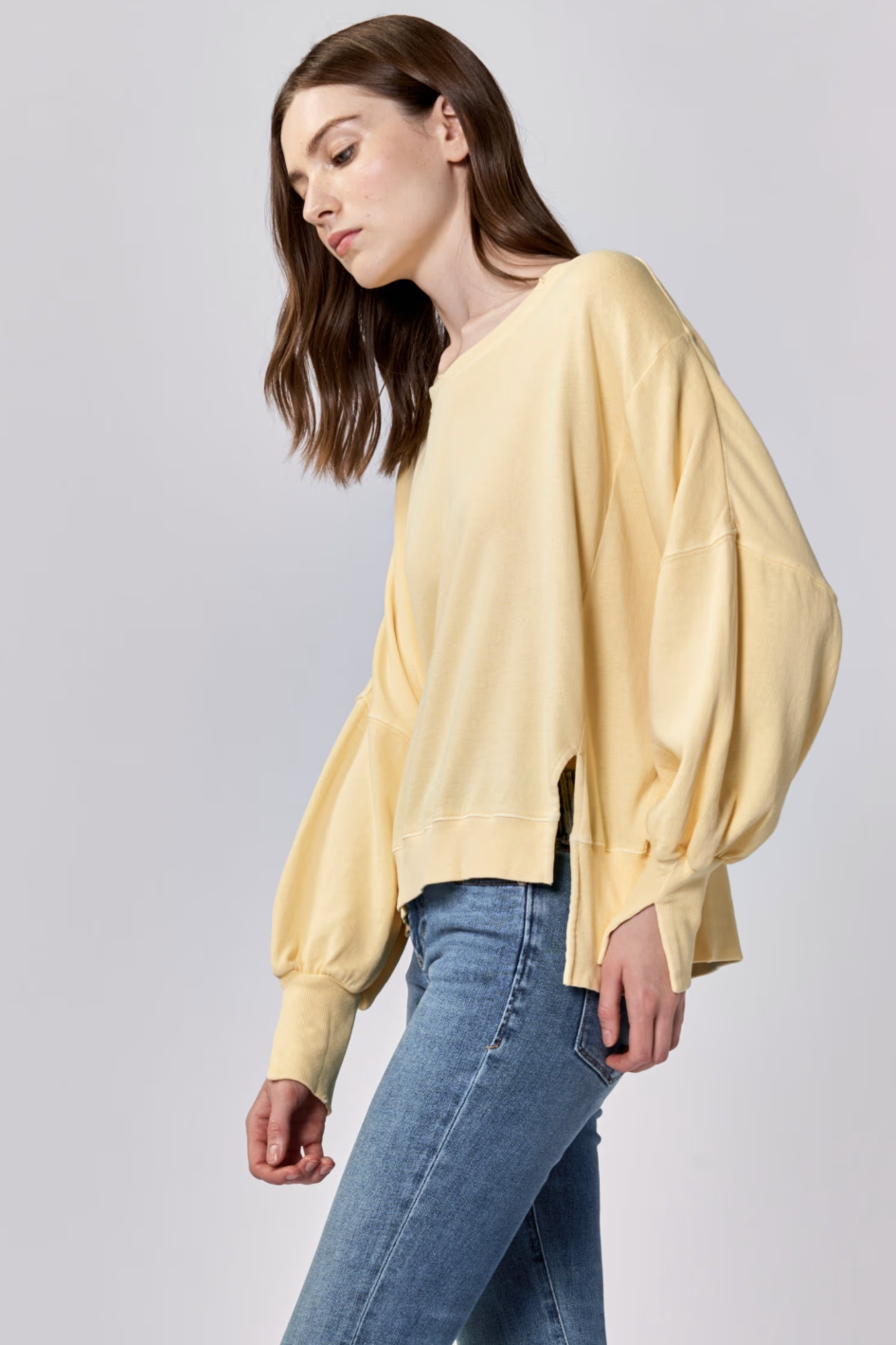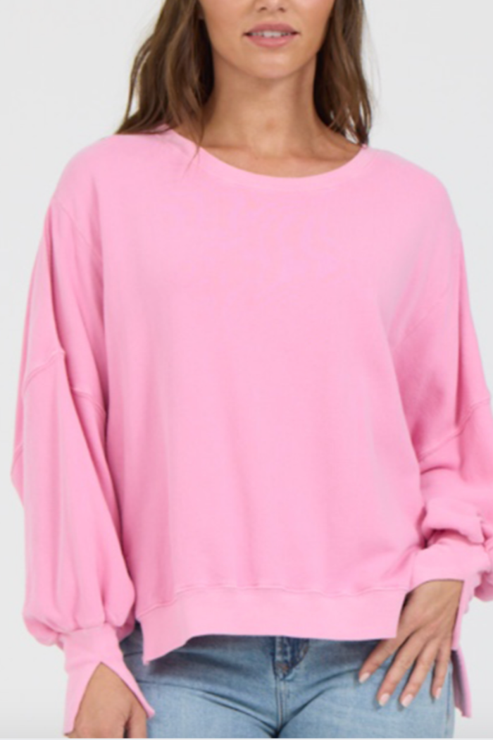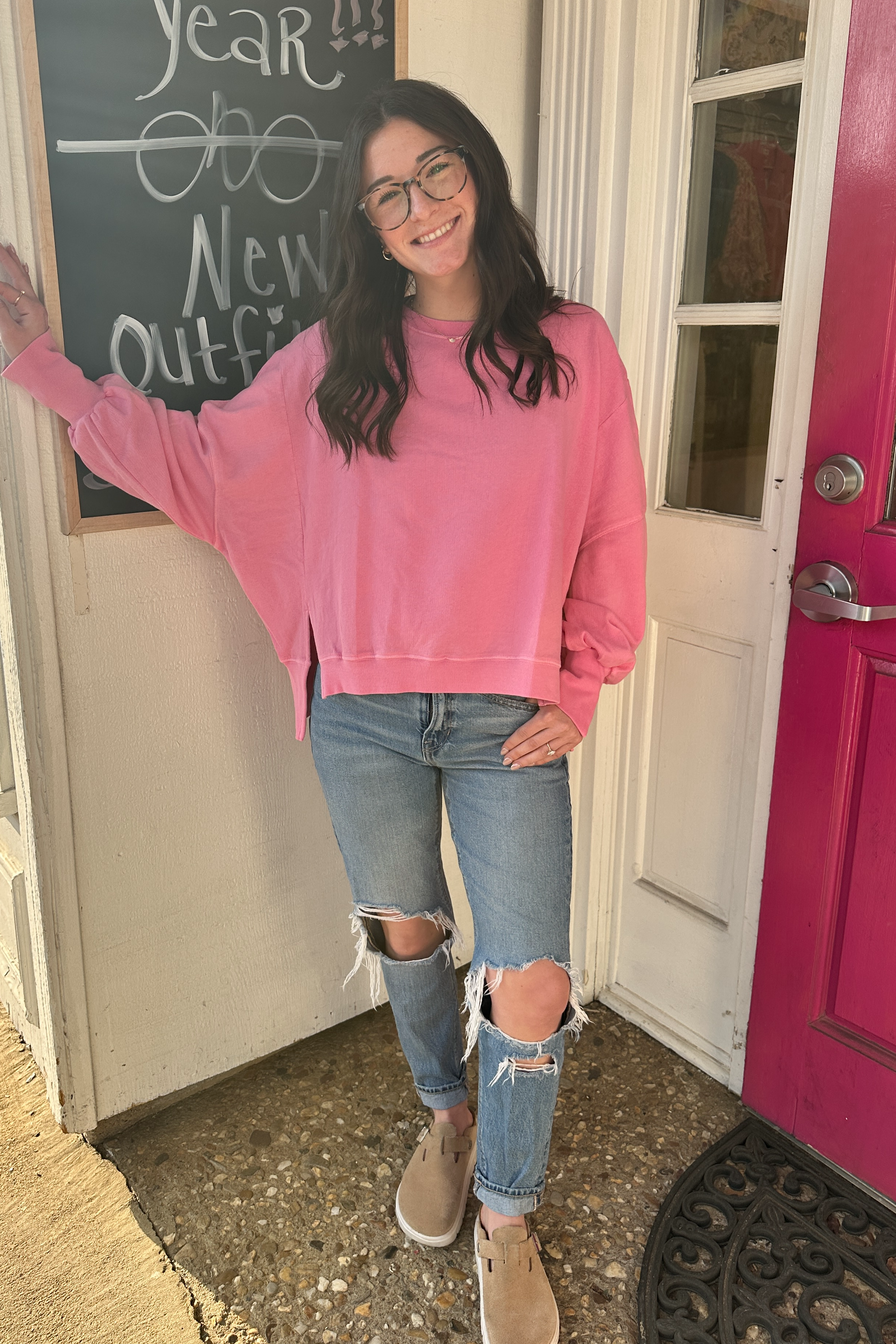 A relaxed oversized crewneck sweatshirt in a soft pink wash with dropped shoulders and side slits for easy layering. The Dear John sweatshirt has long sleeves and a boxy, slightly cropped hem that pairs perfectly with denim. It reads casual and cozy while keeping a contemporary, effortless vibe. Wear it for errands, coffee dates, or lounging at home.