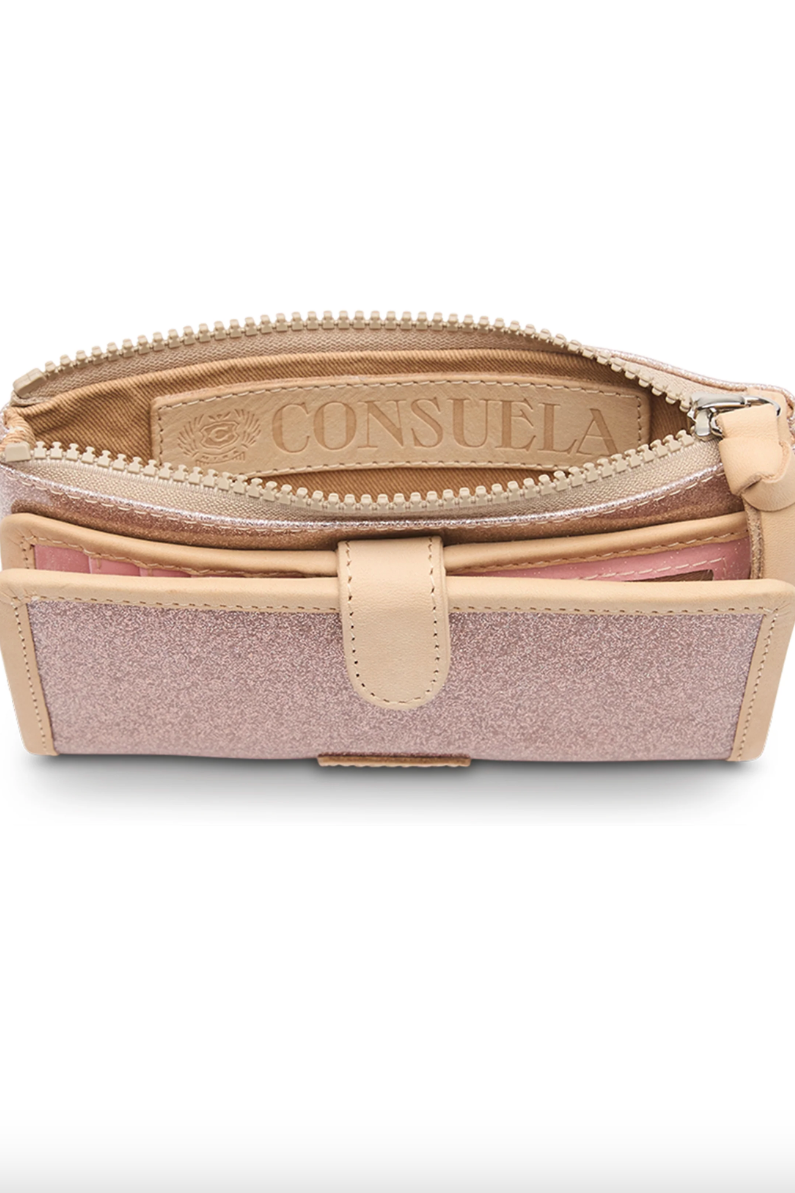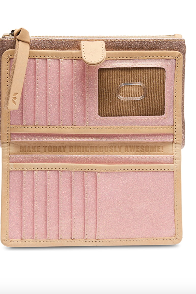 Our Slim Wallet carries cards and cash without weighing you down. Open the snap closure to reveal an ID window pocket, 12 card slots, and 4 slide pocket compartments in this versatile and colorful wallet.