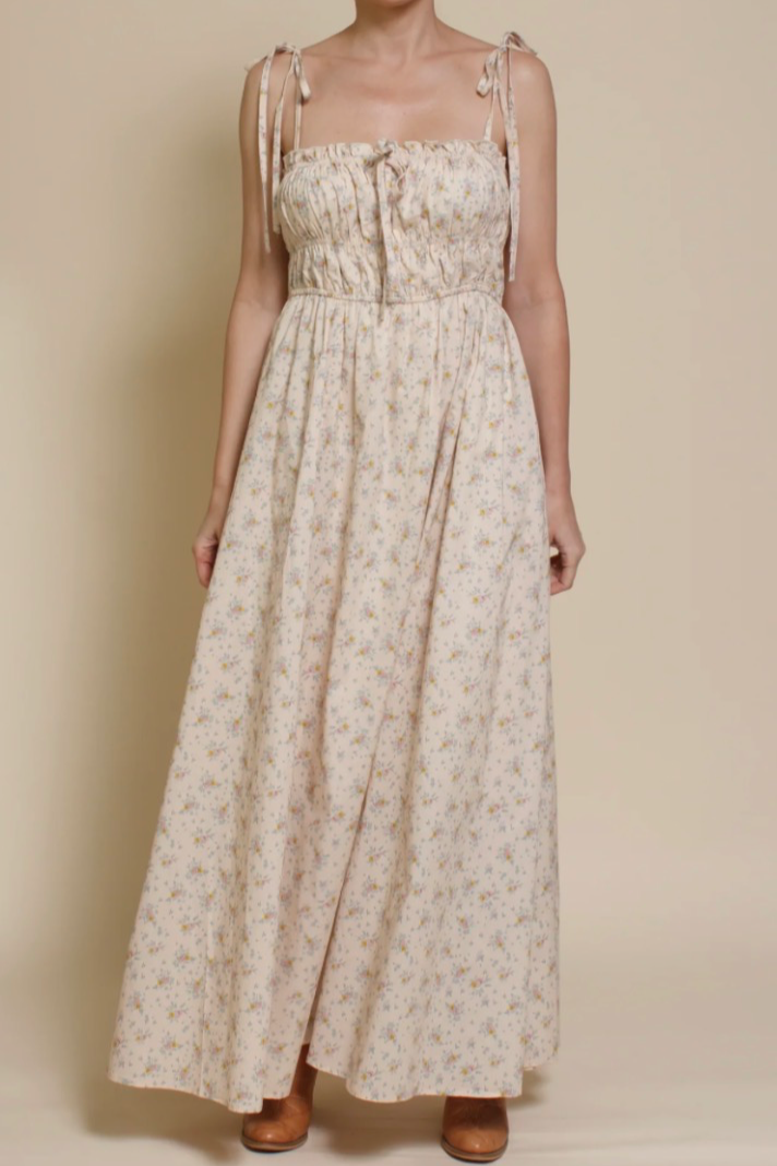Soft and sun-ready, this Floral Tie-Strap Maxi Dress features a smocked bodice and adjustable shoulder ties for a custom fit. The lightweight, printed skirt flows to ankle length for an easy, summery silhouette. It’s styled for casual days and vacation getaways with a romantic, boho-inspired feel. Wear it with sandals for daytime or dress it up with wedges for an evening out.