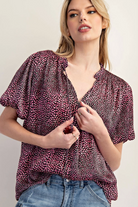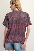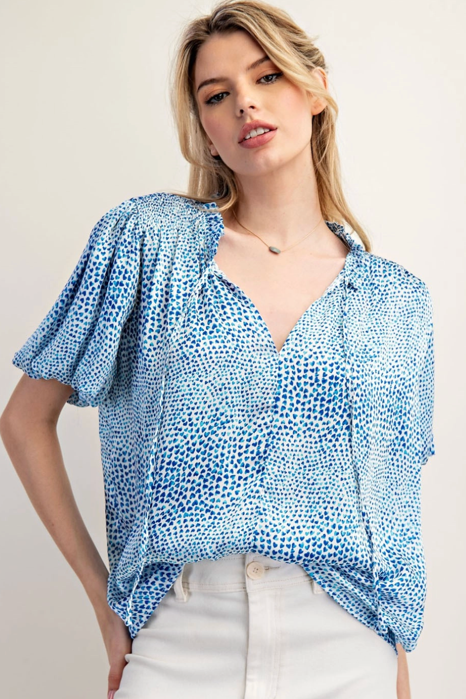 A breezy printed top with a sweet heart-dot motif and relaxed silhouette, perfect for warm days. The Have Heart Printed Top features a V-neckline and short flutter sleeves for an easy, feminine look. This piece is designed by ee:some in a lightweight woven fabric that tucks neatly into high-waist bottoms for casual weekend styling.