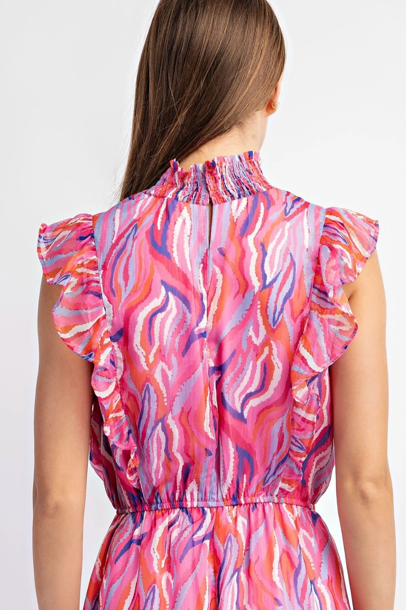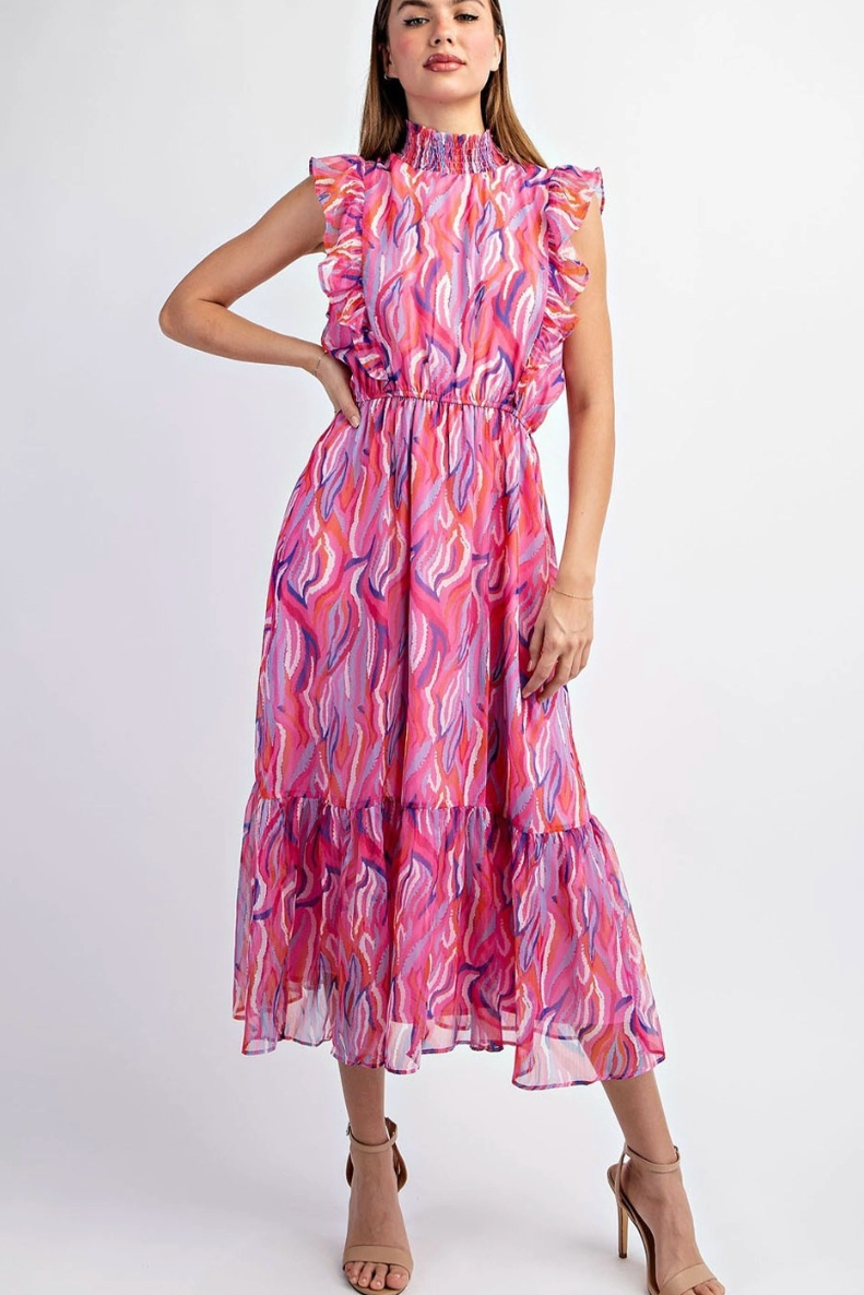 A flowy printed midi with ruffled shoulders and a smocked high neckline, the Heart on the Line Dress feels fresh and feminine. The elastic waist and tiered skirt add easy movement while lightweight, sheer fabric keeps the silhouette airy.