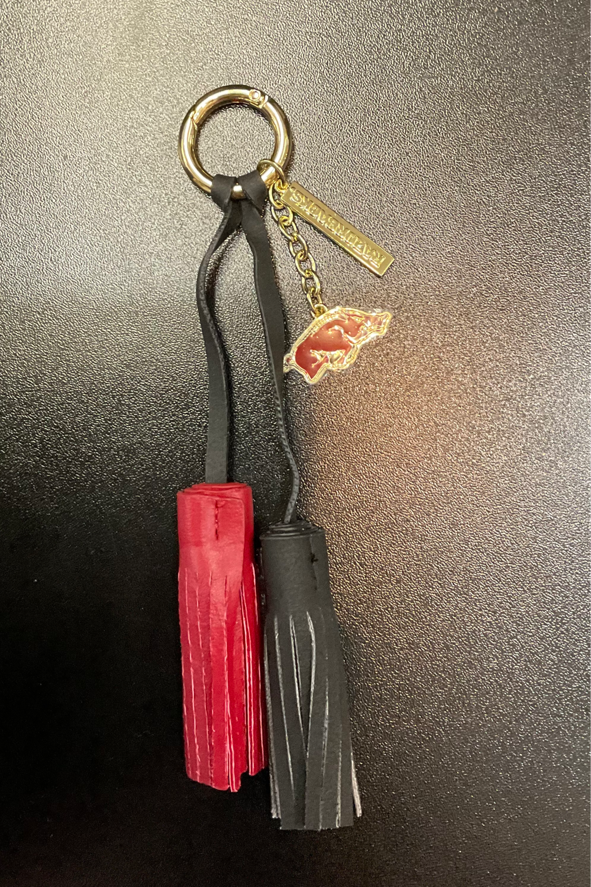 Razorback keychain with two tassels and hog emblem