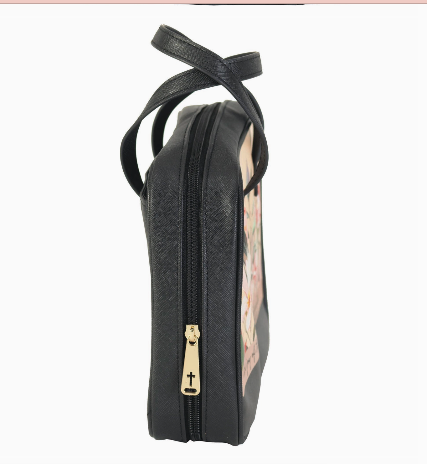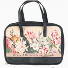 The Joy of the Lord XL Bible Cover is a floral-printed zippered cover sized to hold an extra-large Bible with carrying handles. The front panel appears to be printed canvas framed with textured vegan leather trim and matching straps for durability. Dickson designs this protective cover with a top zip closure and roomy interior for keeping notes and a pen secure. Its polished yet casual look makes it perfect for church, study groups, or everyday carry.
