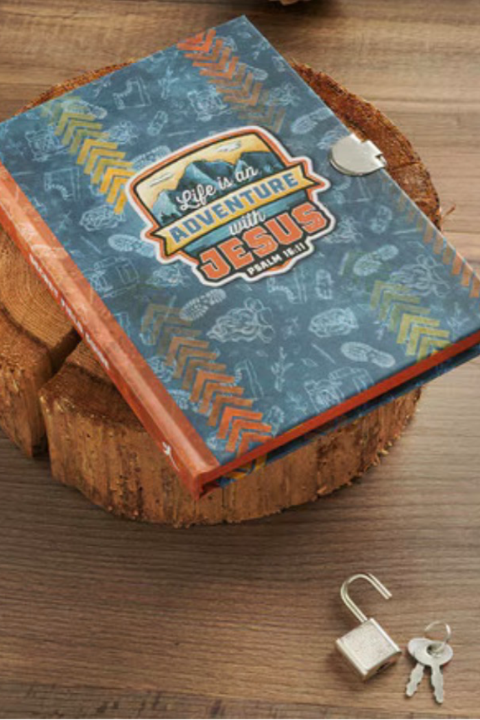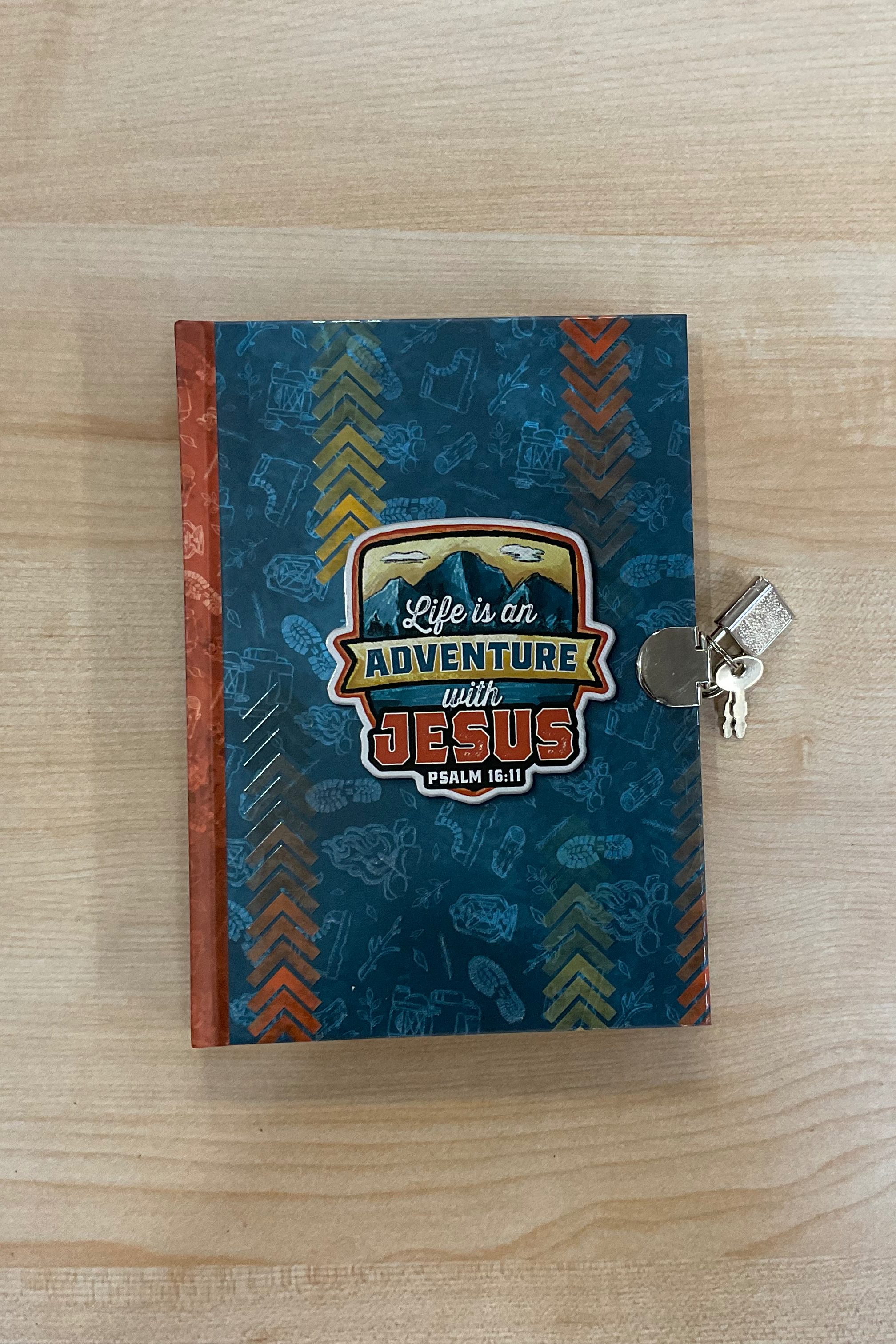 This locked journal features a colorful, illustrated cover that reads “Life is an Adventure with Jesus,” with a small metal clasp and matching keys. The book-style notebook has a sturdy hardcover and a travel-adventure motif printed across the cover. Use it as a daily devotional, prayer journal, or keepsake for notes and reflections.