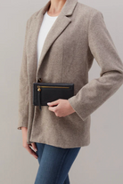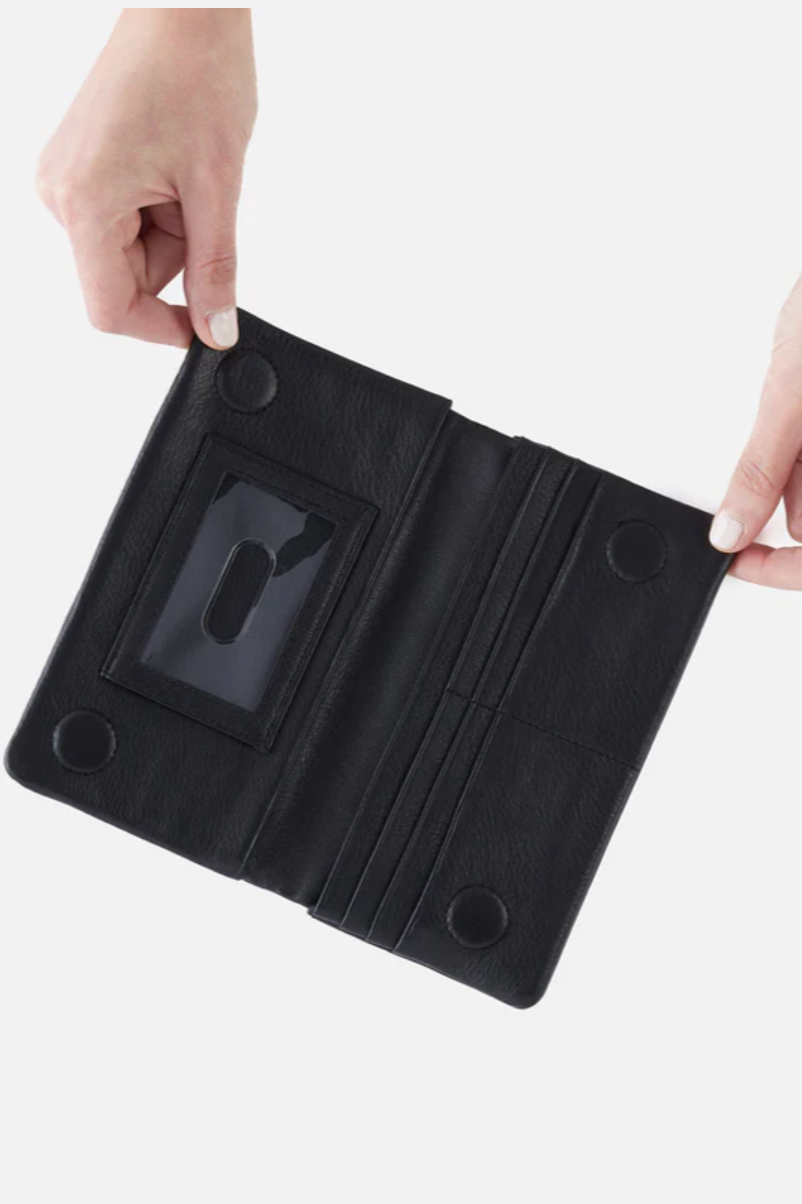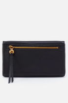 The Lumen Continental Wallet - Black is a streamlined continental wallet featuring a front zip pocket and a pebbled texture. Hobo crafts it from textured black leather for a polished look and durable feel. Its slim silhouette keeps cards, cash, and essentials organized whether you're at the office or out on the town.