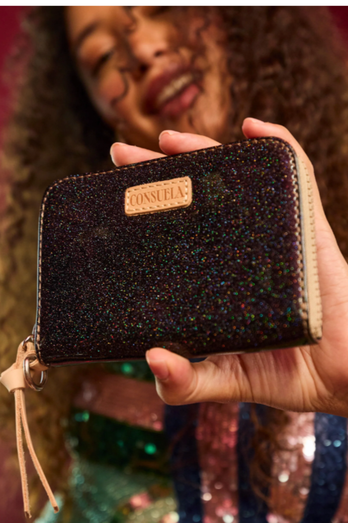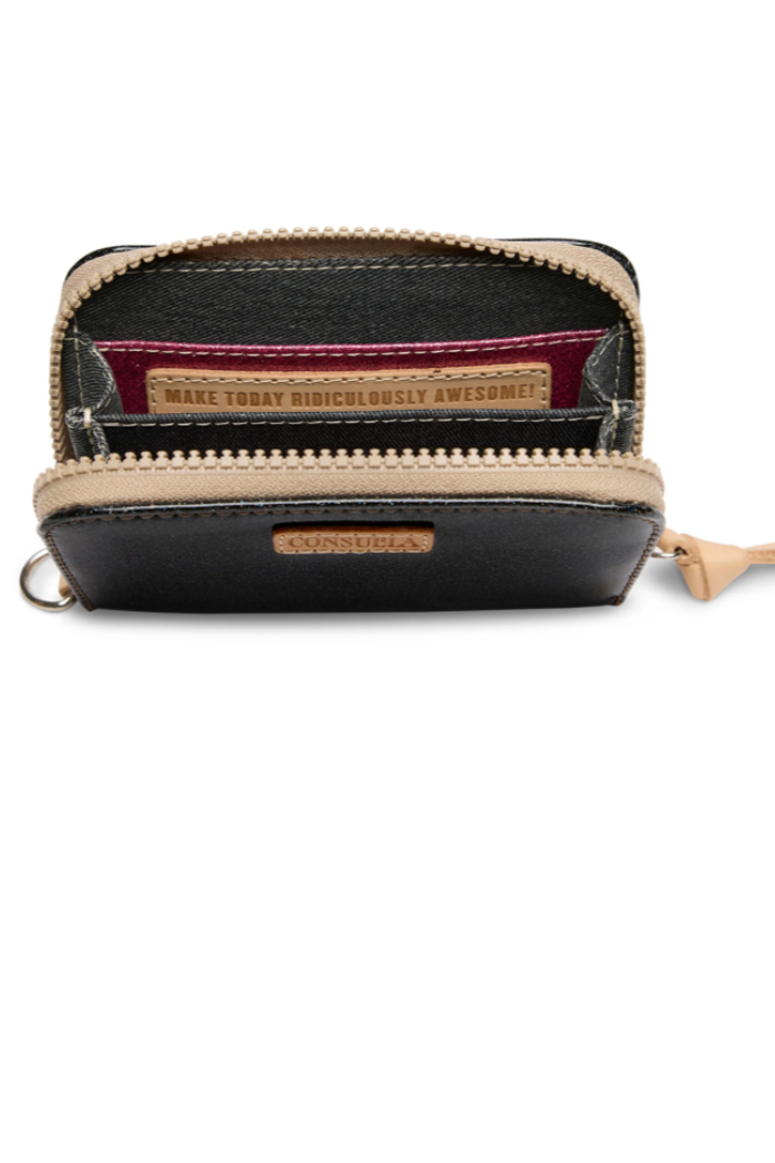 Say hello to Zippy, our newest wallet. This small, but mighty companion has both interior and exterior card slots with a zip closure. Use the D-ring to securely attach Zippy to your bag lanyard or Combi wristlet.