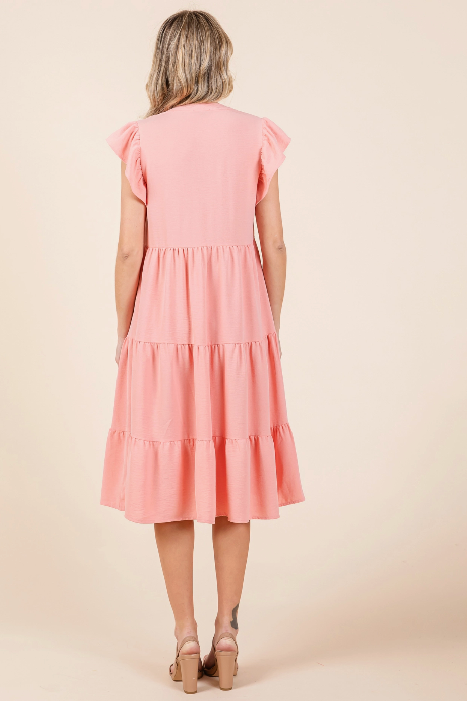 The Peachy Keen Tiered Dress is a breezy, tiered midi with flutter sleeves and a relaxed, swing silhouette. Designed by RolyPoly, it lands perfectly between casual and vacation-ready with light movement and soft drape. The V-notch neckline and tiered skirt add a romantic, boho feel while keeping the look effortless for daytime outings. Pair it with sandals for warm-weather wear or dress it up with heels for a weekend event.