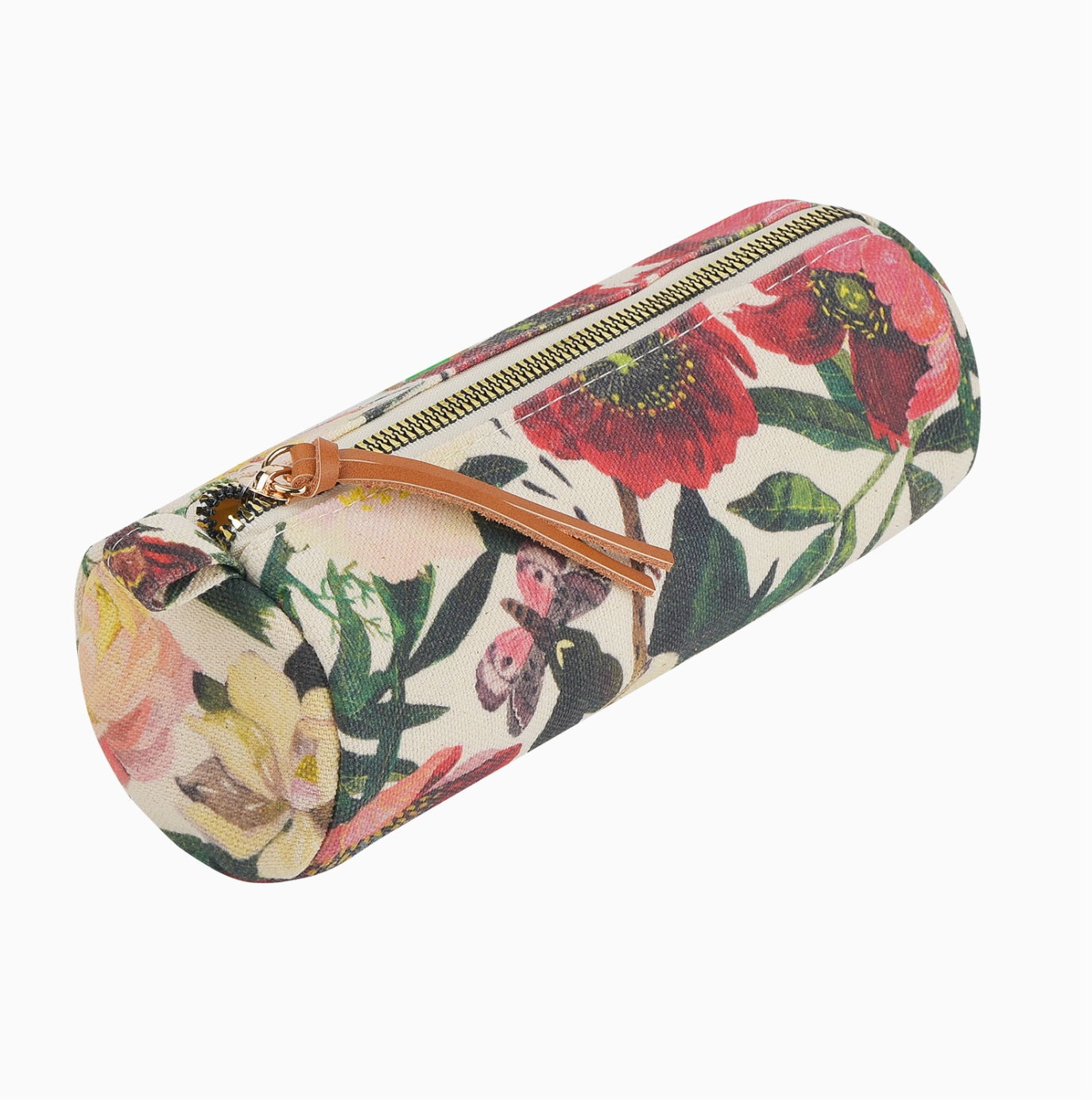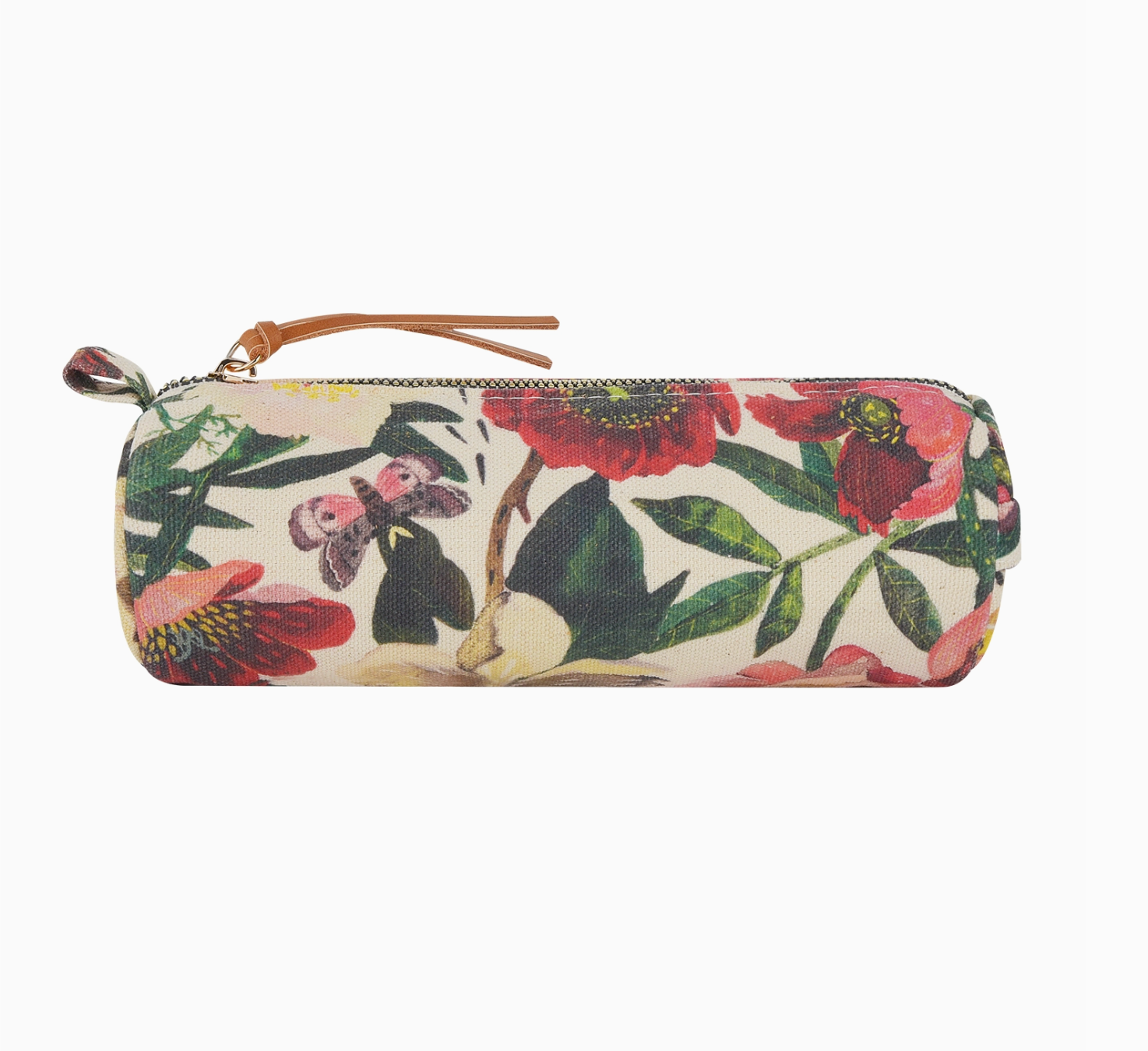 This beautifully crafted heavy-duty canvas Pencil Pouch boasts a vibrant floral print. It features a gusseted design and a sturdy brass zipper for secure closure. This versatile bag is ideal for carrying pens, pencils, makeup, chargers, and wires.