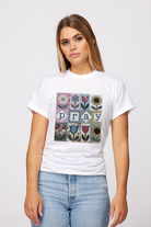 Soft cotton graphic tee printed with a patchwork-style floral block spelling “pray.”