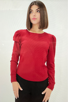 A tailored red long sleeve top with subtle puff shoulders and a rounded crew neckline. The Red Puff Shoulder Long Sleeve Top is crafted from a fine knit with a streamlined silhouette that tucks neatly into trousers or skirts. Its polished yet easygoing look makes it a great everyday piece for casual outings or smart-casual settings. Lightly structured shoulders add a touch of modern detail without overwhelming the clean lines.