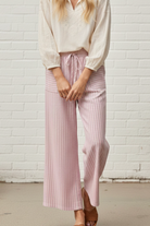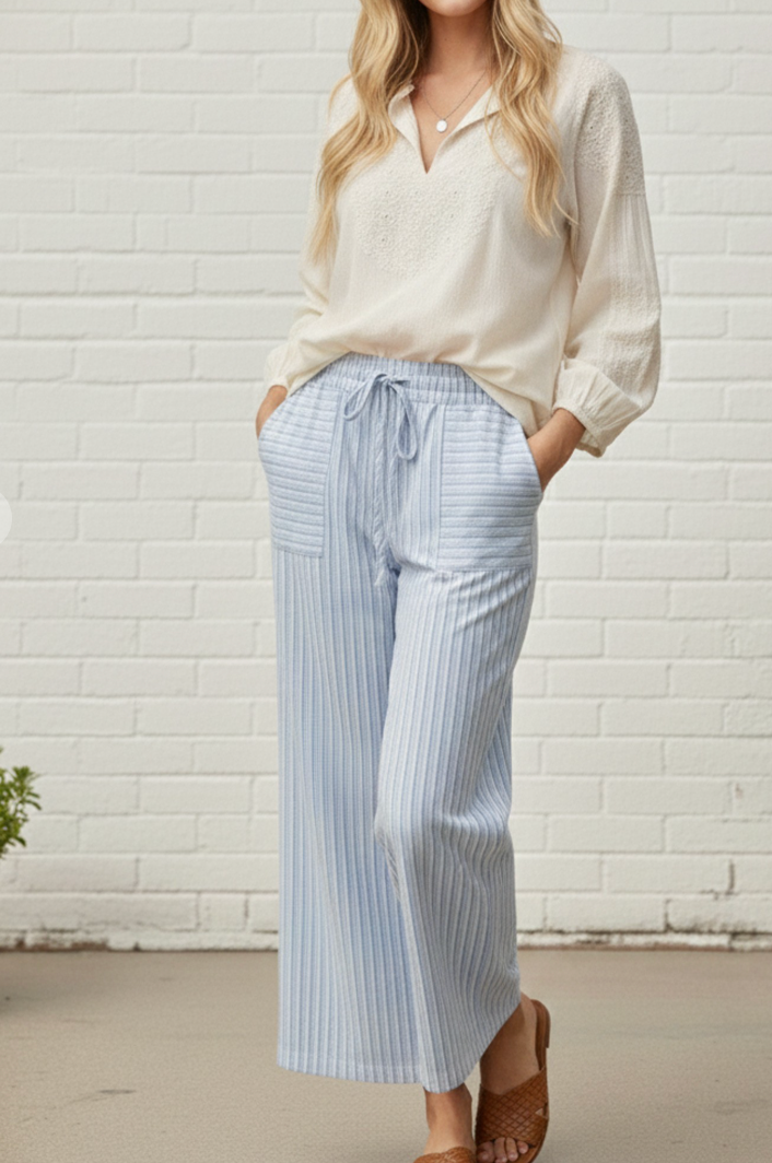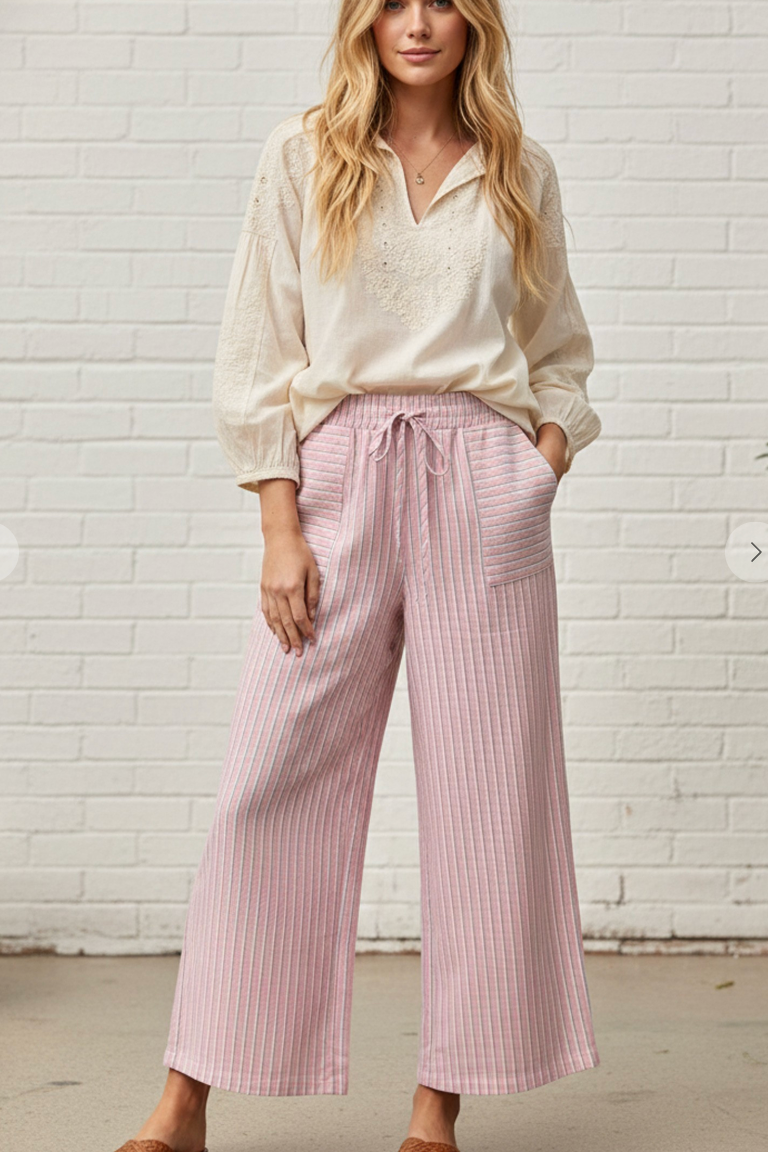 These full-length striped pants are made from 100% soft cotton for a breathable and natural feel. Featuring a relaxed wide-leg silhouette with a 25" inseam, drawstring waist, inside lining, and front patch pockets, they blend comfort and style effortlessly. The subtle vertical stripes add a timeless touch, perfect for casual outings or laid-back weekends.