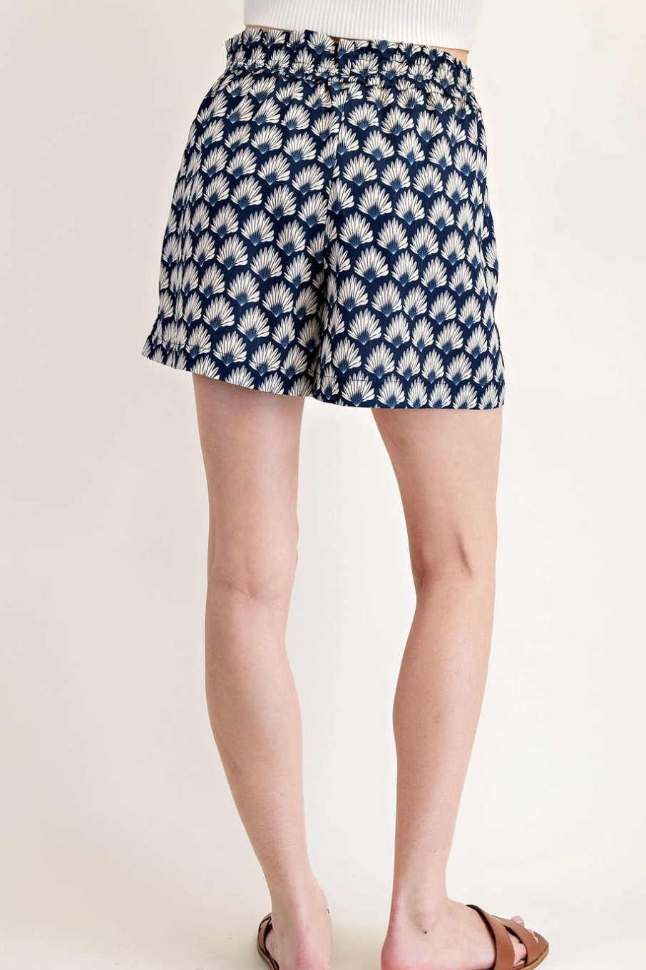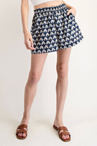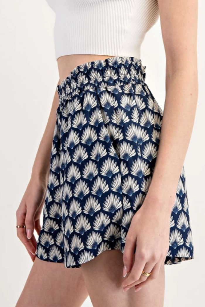 Breezy printed shorts with a relaxed silhouette and an elasticated high waistband for easy, all-day comfort. The Uptown Charm Print Shorts feature a navy-and-cream fan motif and side pockets for casual convenience. Lightweight woven fabric and a slightly flared leg make them ideal for warm-weather errands or weekend outings.