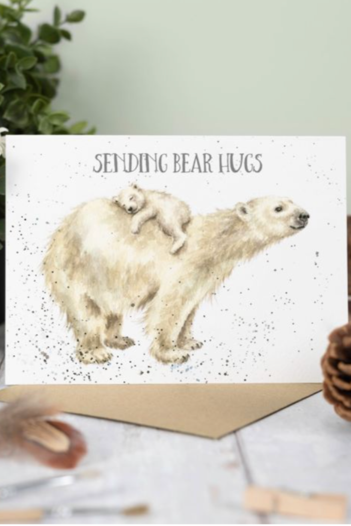Send someone your best wishes with this lovely polar bear card which reads 'Sending Bear Hugs.' The card is printed on high quality, sustainably sourced textured board. It measures 6.77 x 4.84 inches and is supplied wrapped with a recycled, kraft envelope. The message inside reads 'with love.'