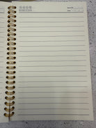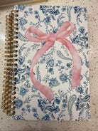 A spiral-bound notebook with a floral blue and white cover accented by a large pink bow motif. The Floral & Bow Notebook offers lined pages for notes, lists, and journaling with a decorative hardcover for durability. The gold-tone coil binding allows pages to lie flat for easy writing. S4 designed this charming stationery piece to add a feminine, gift-ready touch to any desk or bag.