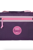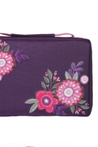 The purple polyester Bible case features a pink rubber medallion embossed with a white and purple-colored sentiment.