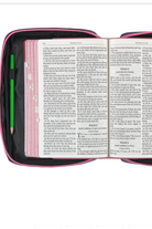 Come rain or shine; the water-resistant Bible case ensures your daughter's Bible stays well-protected. The front cover features a zippered pocket for loose notes or change, adorned with a vibrant pink zipper, knotted pink cord zipper pull, and coordinating lilac binding. The pink rope zipper pull also appears on the pink zipper that closes the cover. For added convenience, a robust pink webbed nylon handle, covered in soft purple polyester, folds completely flat, allowing both the case and the Bible to lay open.