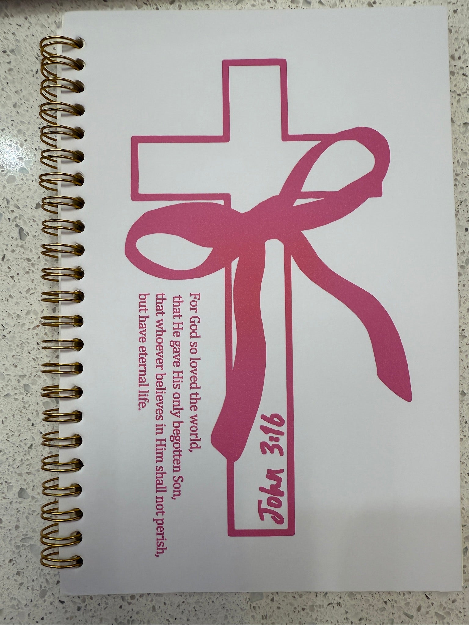 A spiral-bound notebook featuring a pink cross and the John 3:16 verse on the cover. The John 3:16 Notebook is sized for daily notes, journaling, or church groups and has a durable cardstock cover and gold-tone spiral binding. S4 designed this edition with bold religious graphics and large ruled pages for easy writing. Keep it on your desk or carry it to services for quick reflections and note-taking.