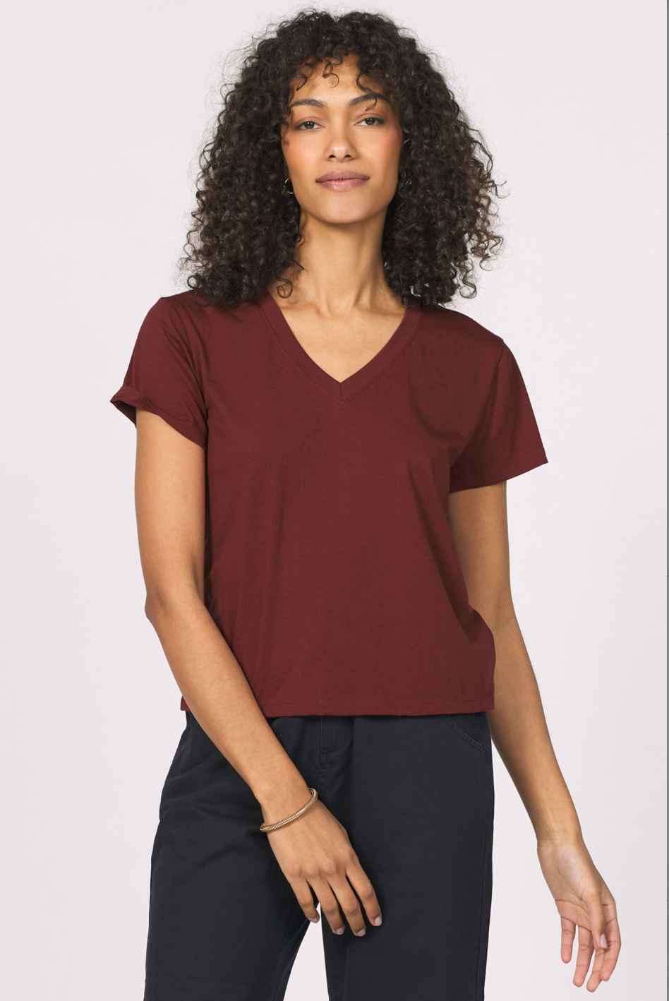 The effortless Amaya v-neck tee is an essential piece is for both comfort and elegance in any wardrobe. Its short-sleeve with a flattering v-neck, cut for versatility for a relaxed fit, making it an essential piece in your collection of cozy wear. Versatile t-shirt that pairs perfectly with jeans, skirts, or under a blazer for a sophisticated look.