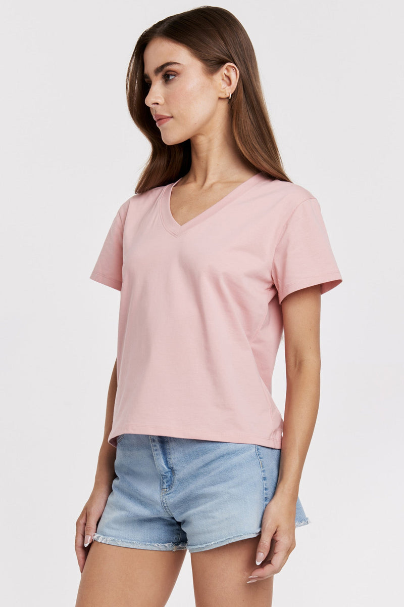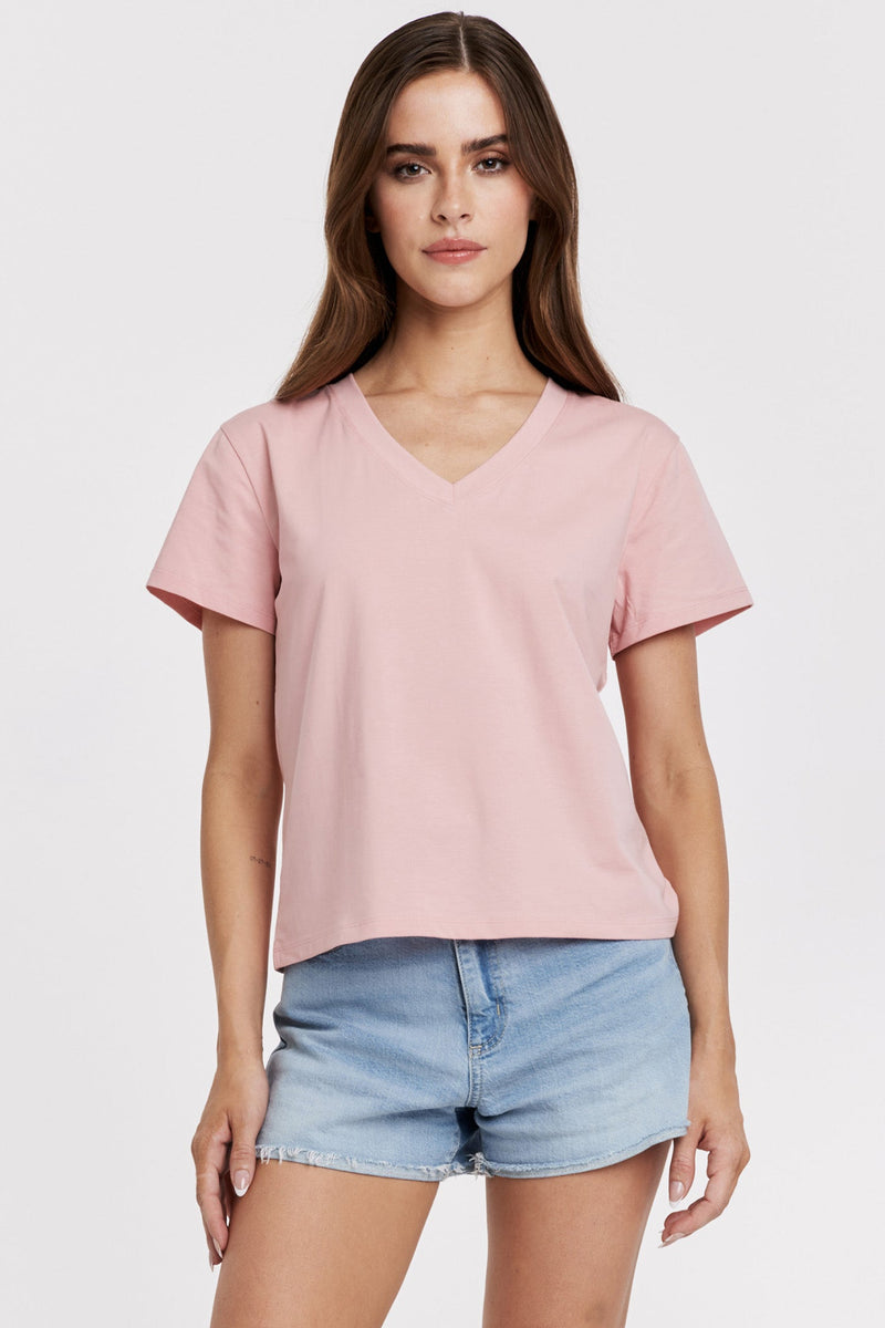 The effortless Amaya v-neck tee in a stunning designer shades. This essential piece is designed for those who desires both comfort and elegance in their wardrobe. With a flattering v-neck cut, it provides versatility to seamlessly transition from casual days to chic evenings. Its short-sleeve design ensures a relaxed fit, making it an essential piece in your collection of cozy wear. Everyday outfits with this versatile t-shirt that pairs perfectly with jeans, skirts, or under a blazer for a sophisticated look.