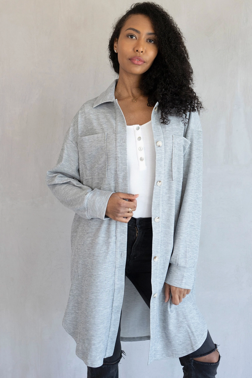 An oversized shirt jacket cut in a soft, slub-knit fabric for an easy lived-in look. The Oversized Shirt Jacket buttons down the front and features a relaxed collar, drop shoulders and roomy patch pockets for effortless layering. Its long, tunic length makes it perfect over jeans or a fitted dress for a casual, modern silhouette. Wear it as a lightweight outer layer from season to season.