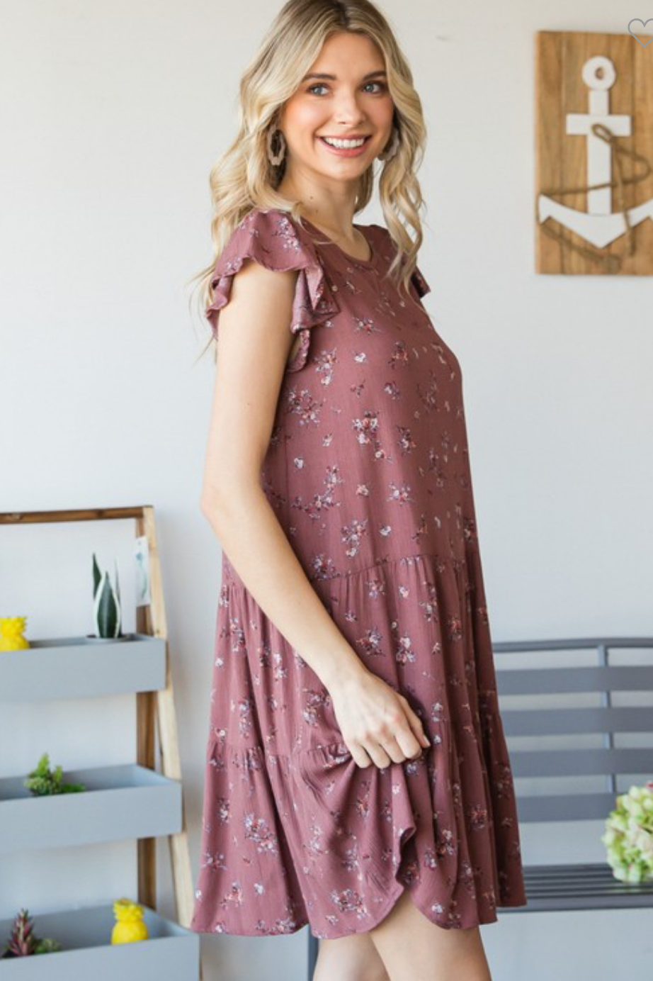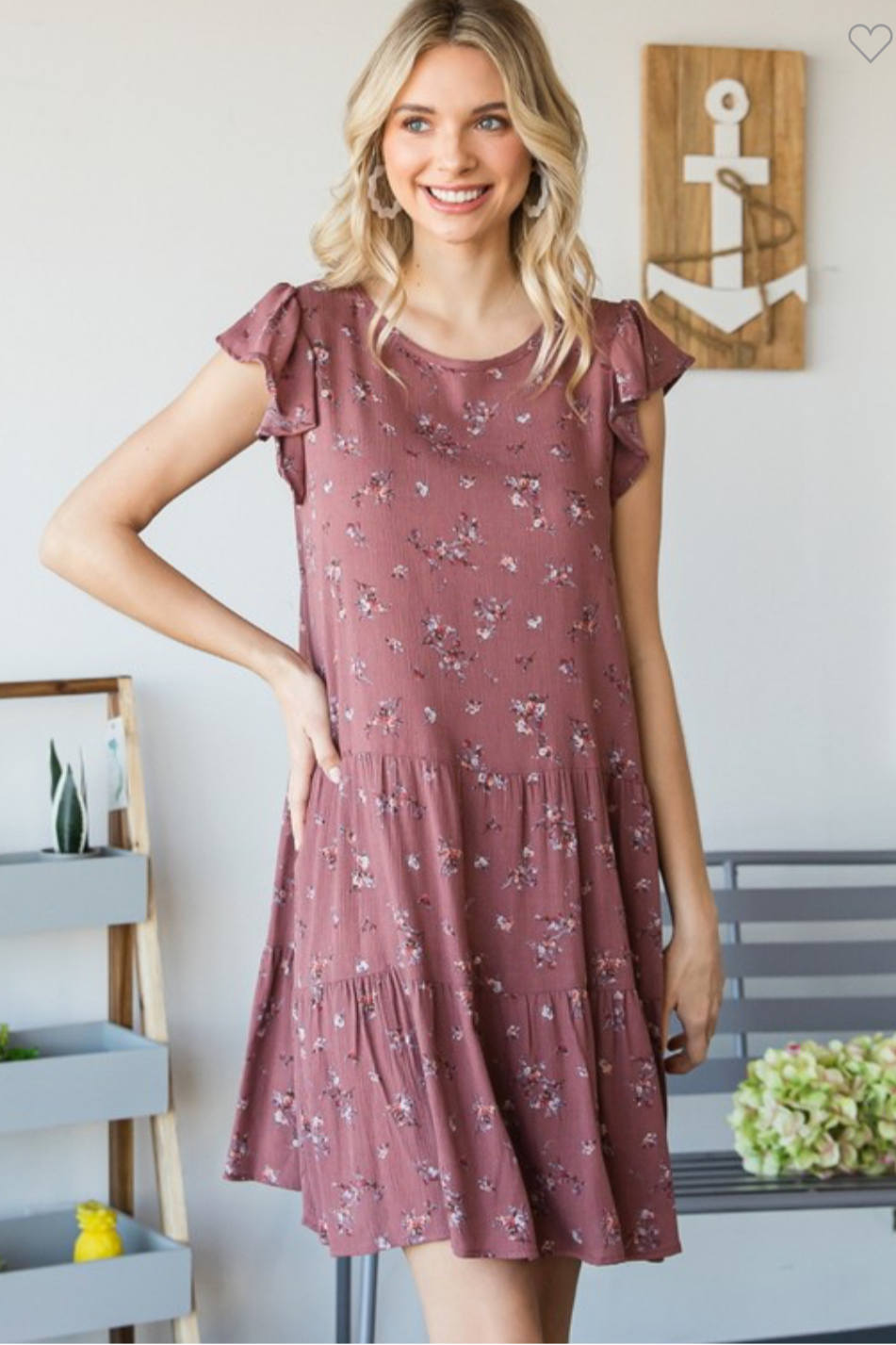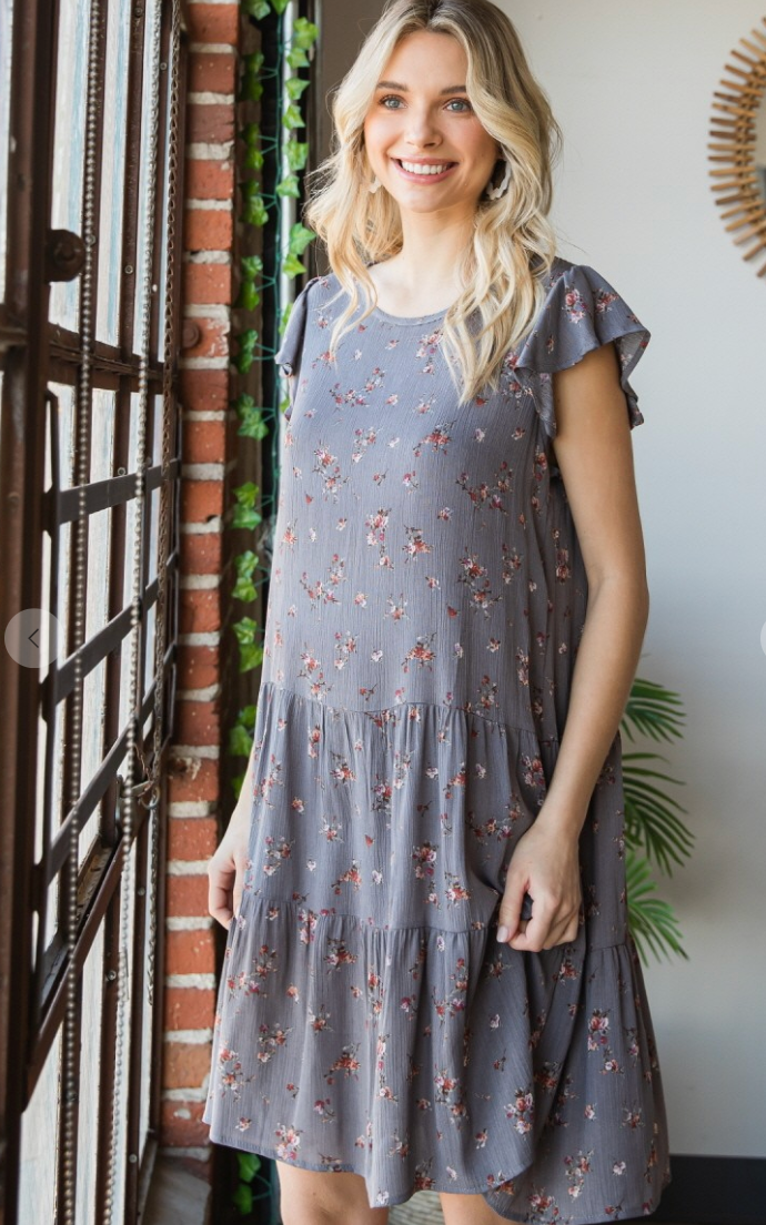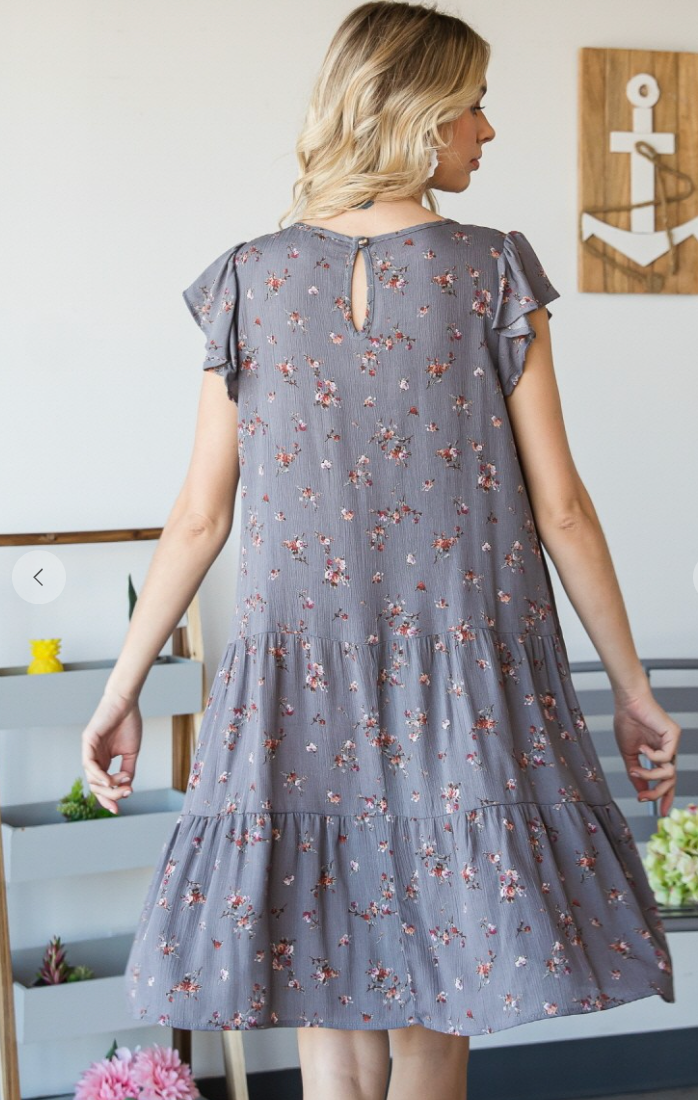 Woven Rayon Floral Flutter Sleeve Shirred Tiered Dress with Back Button Closure